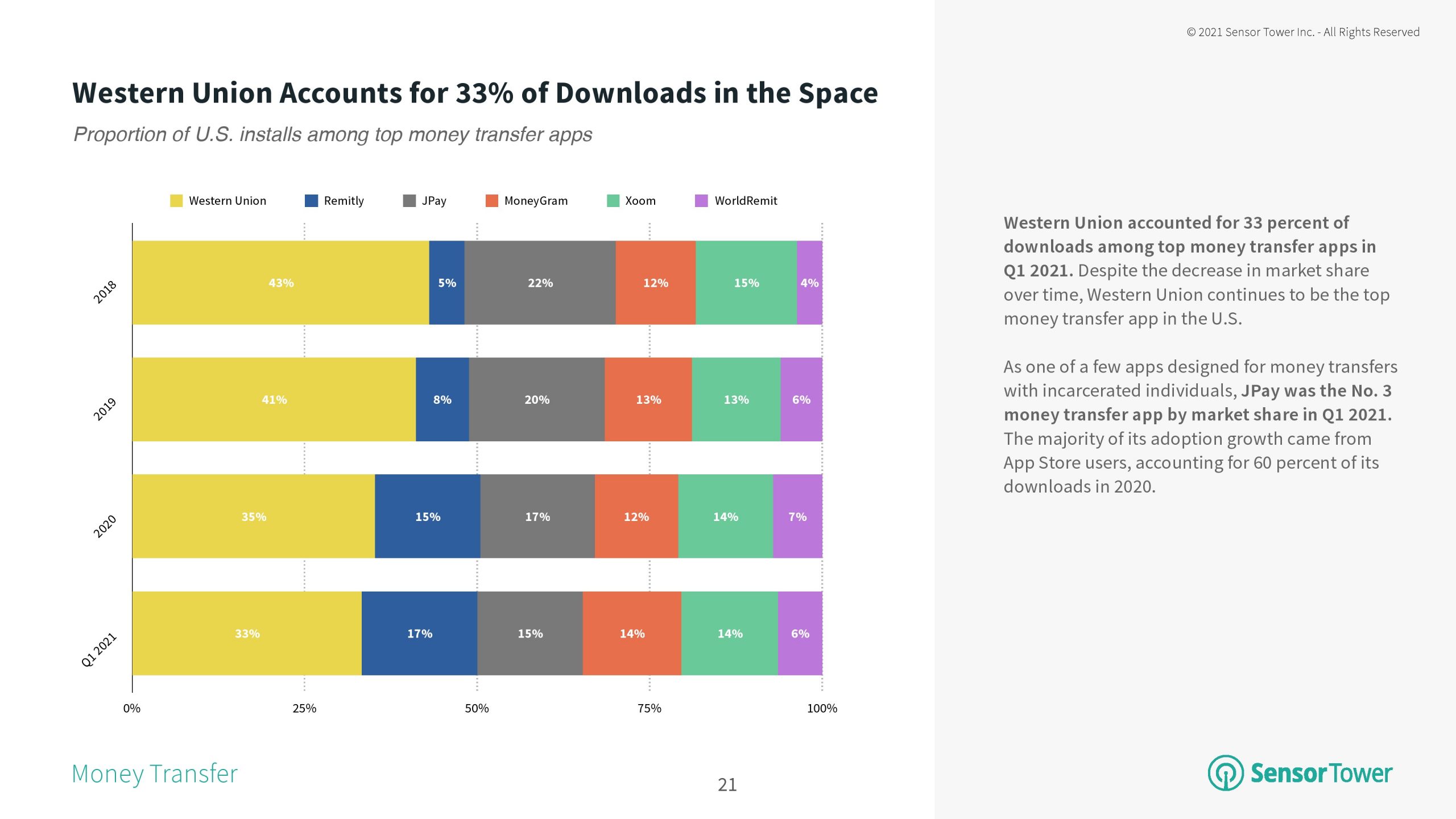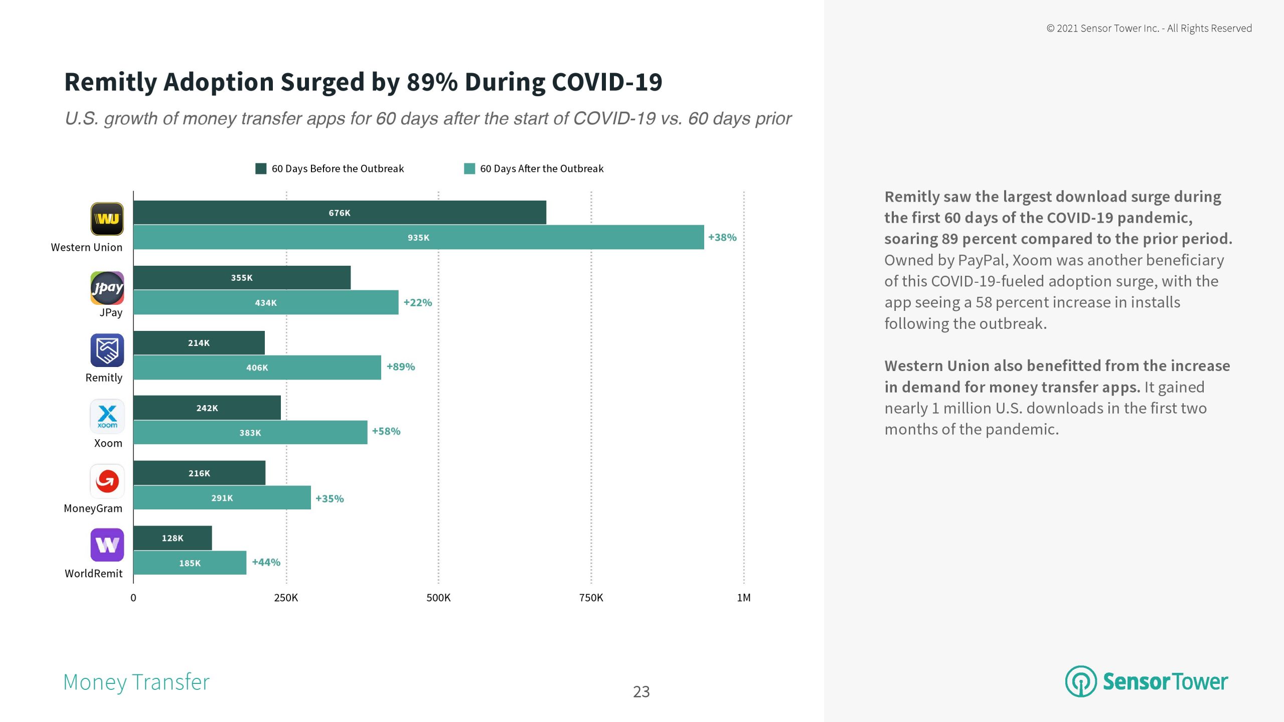 目前的新冠大流行导致了广泛的财政困难,消费者寻求资金收发解决方案时,转账应用程序就成了一个受欢迎的选择。Western Union的应用是美国转账应用的领头羊,其安装量在2020年4月同比增长49%,达到48.5万次。该子类别的安装量今年仍在上升,2021年1月同比增长44%。