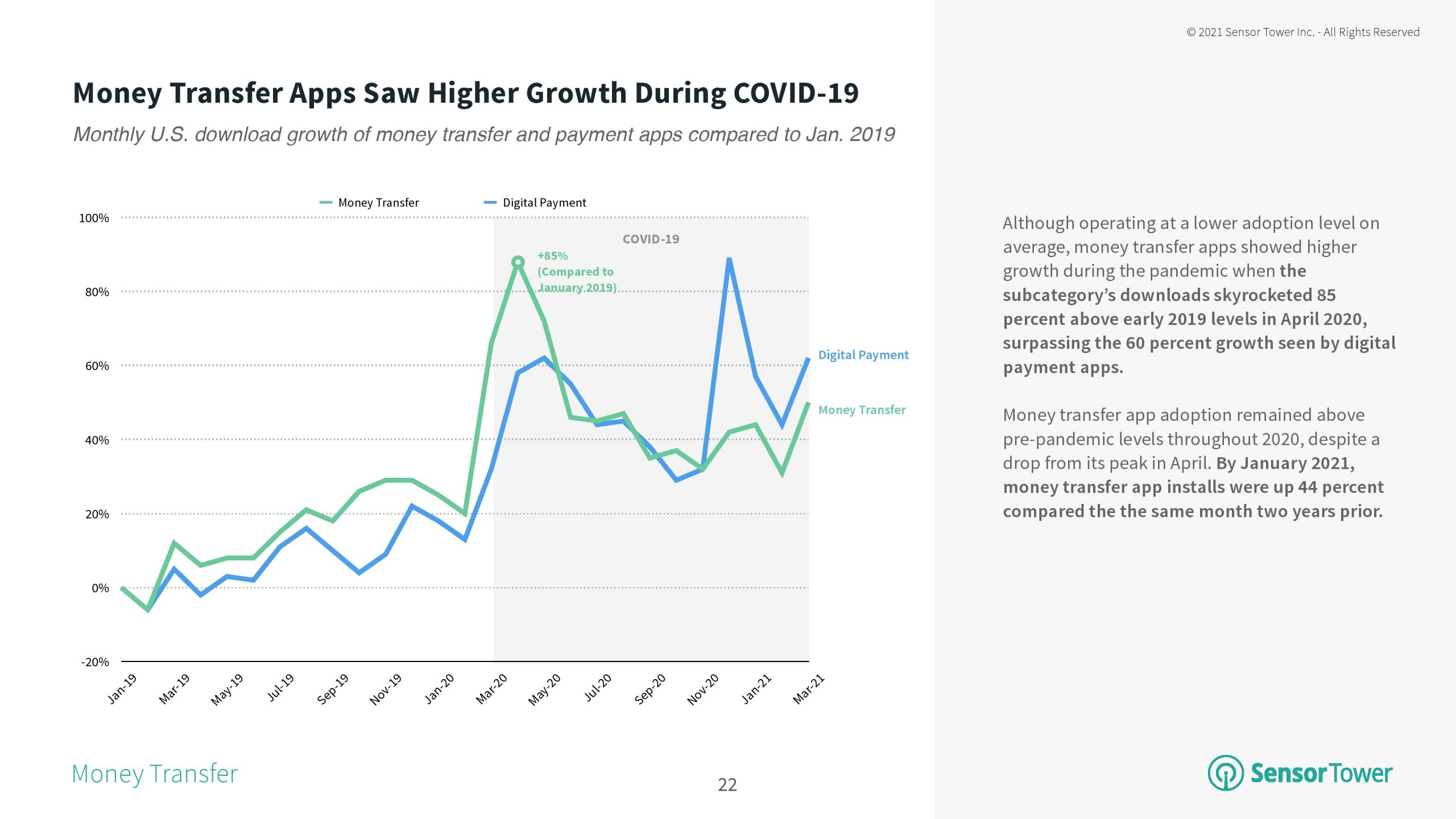 尽管在新冠大流行初期转账应用程序的安装速度超过了数字支付,但后者在2020年假期前后出现了峰值,并经历了持续的提升。