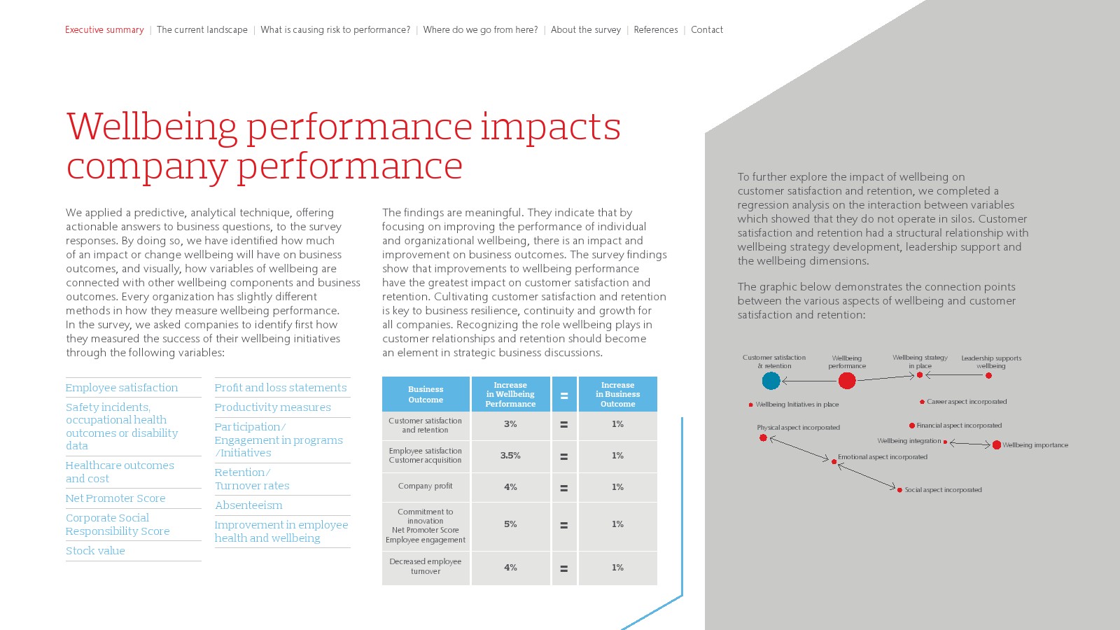 福利绩效影响公司绩效。报告运用了一种预测性的分析技术,为商业问题提供可行的答案。调查已经确定了福利会对商业结果产生影响,但是每个企业在衡量福利绩效的方法上略有不同。