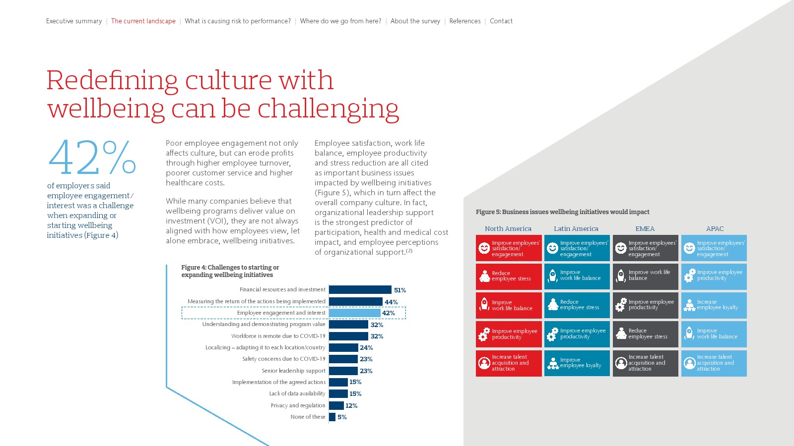 重新定义福祉文化充满了挑战性。42% 的雇主表示,在扩大或启动福利计划时,员工敬业度/兴趣是一个挑战。在解决福利问题方面,大流行需要保持社交距离是最大的障碍(38%),其次是远程工作(27%)。