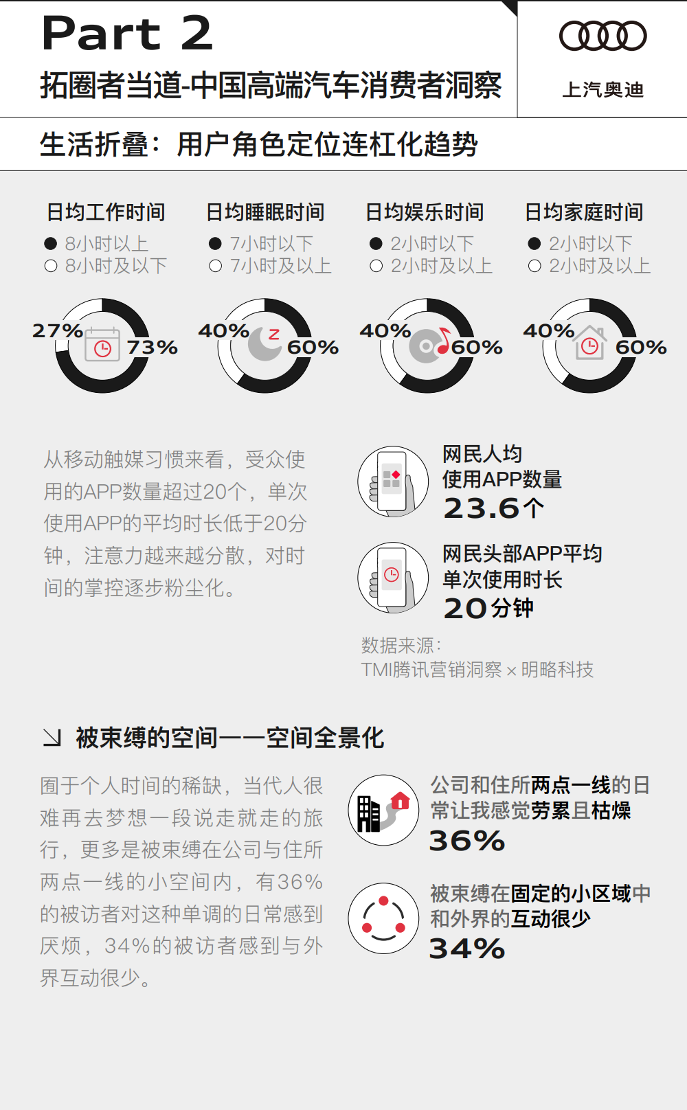生活折叠,人们时间分配失衡与注意力分散,进一步造就了时间的粉尘化;空间折叠,大多数时候人们都局限在公司与住所两点一线的空间之内,与外界的互动有限;身份折叠,车主承担着多重身份与责任。