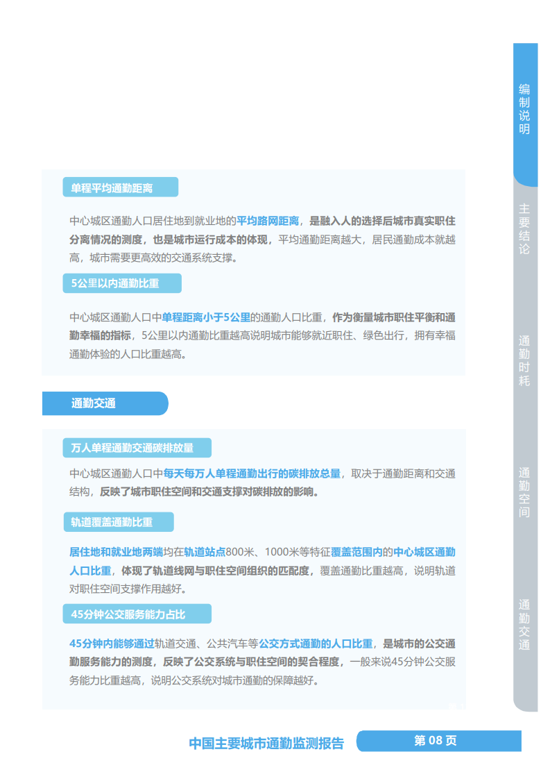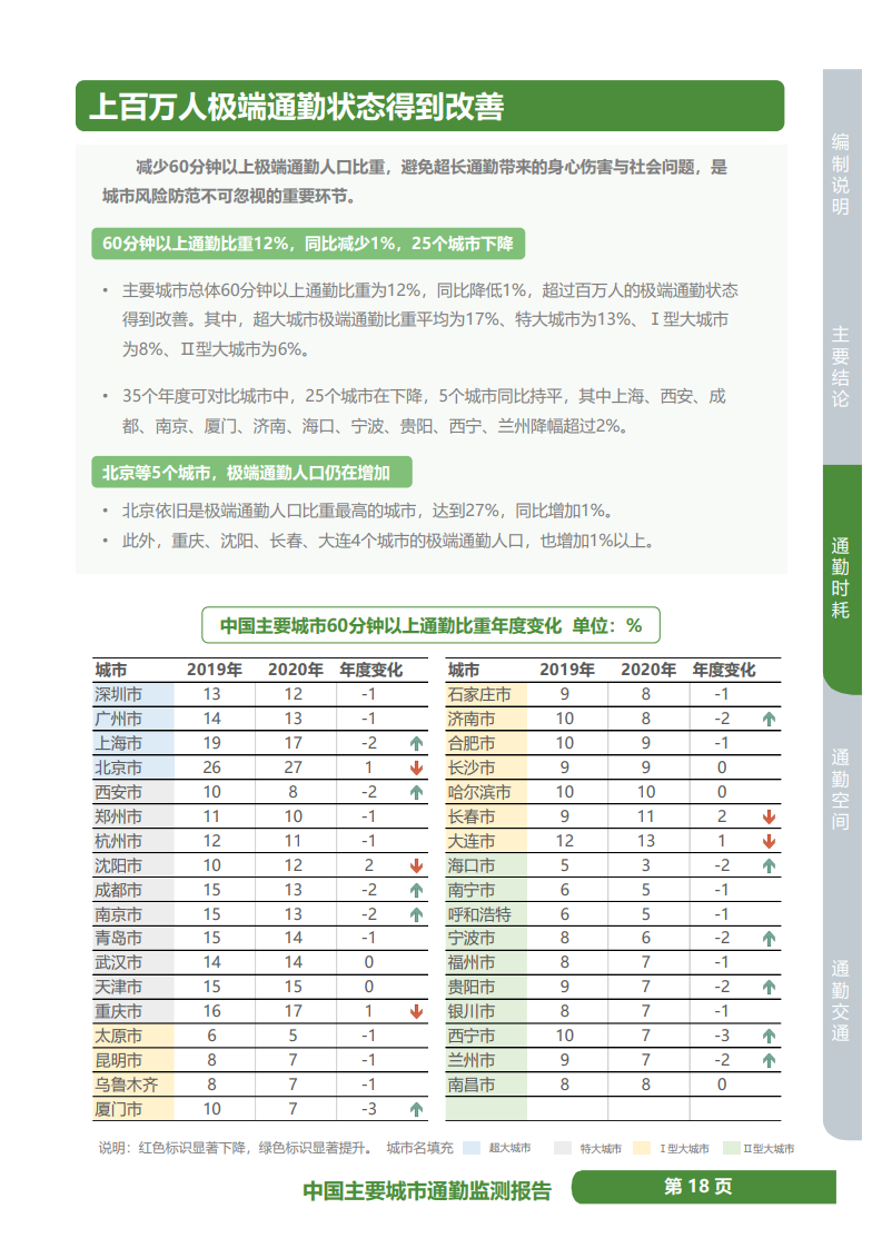 《通勤监测报告》显示,2020年,中国主要城市总体60分钟以上通勤比重为12%,同比降低1%,超过百万人的极端通勤状态得到改善,35个年度可对比城市中25个城市降低、只有5个城市增加,西宁、厦门是改善最显著的城市,但沈阳、长春、北京、重庆、大连极端通勤还在增加。