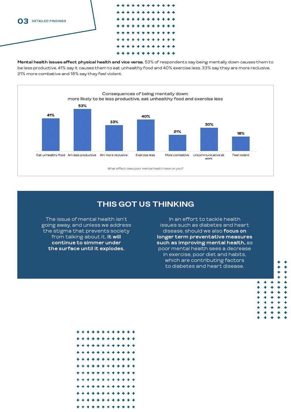 68%的受访者认为新加坡存在对心理健康问题的污名化趋势,超过65%的人甚至在有问题的时候也不会与家人聊这个话题。但是,不良的心理健康会导致真正的社会问题,工作效率低下、不良的健康习惯、好斗甚至暴力。