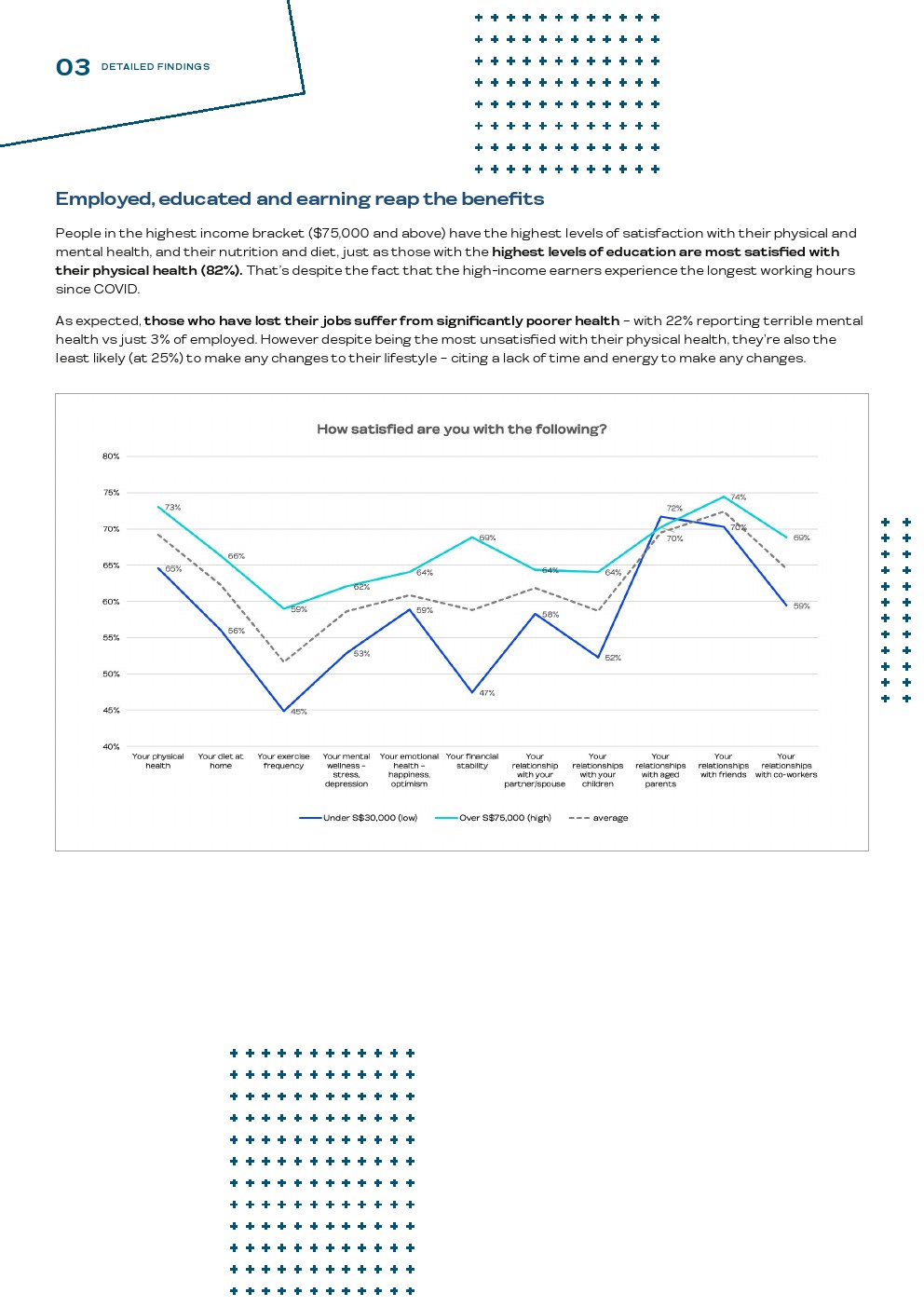 如果是男性,收入在75000美元以上,有研究生学历,并且有工作,那么其对身体和心理健康的满意度会大大提高。相反,那些失业和收入较低的新加坡人不太可能积极主动地作出健康决定,而且女性也比男性更可能感到不健康,表现出更不健康的行为,例如吃劣质食物和不锻炼身体。