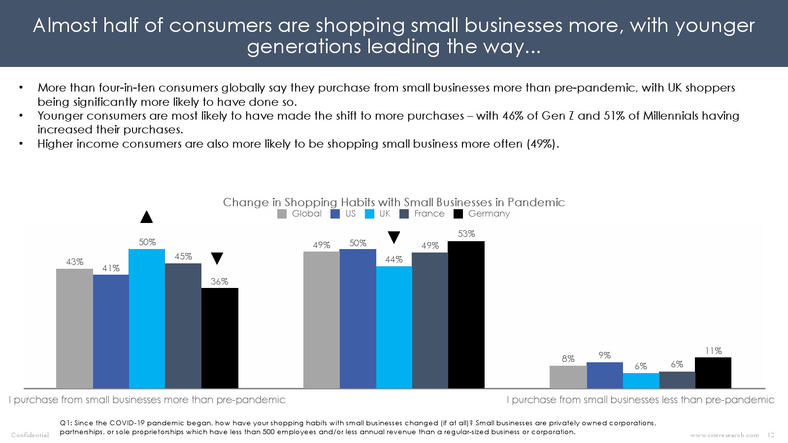 全球超过4/10的消费者(44%)从小企业购买的商品比大流行前多。年轻一代正在引领这一转变,46%的Z世代和51%的千禧一代更多地购买小企业产品。消费者觉得自己与小企业的联系更紧密,并希望帮助当地经济。