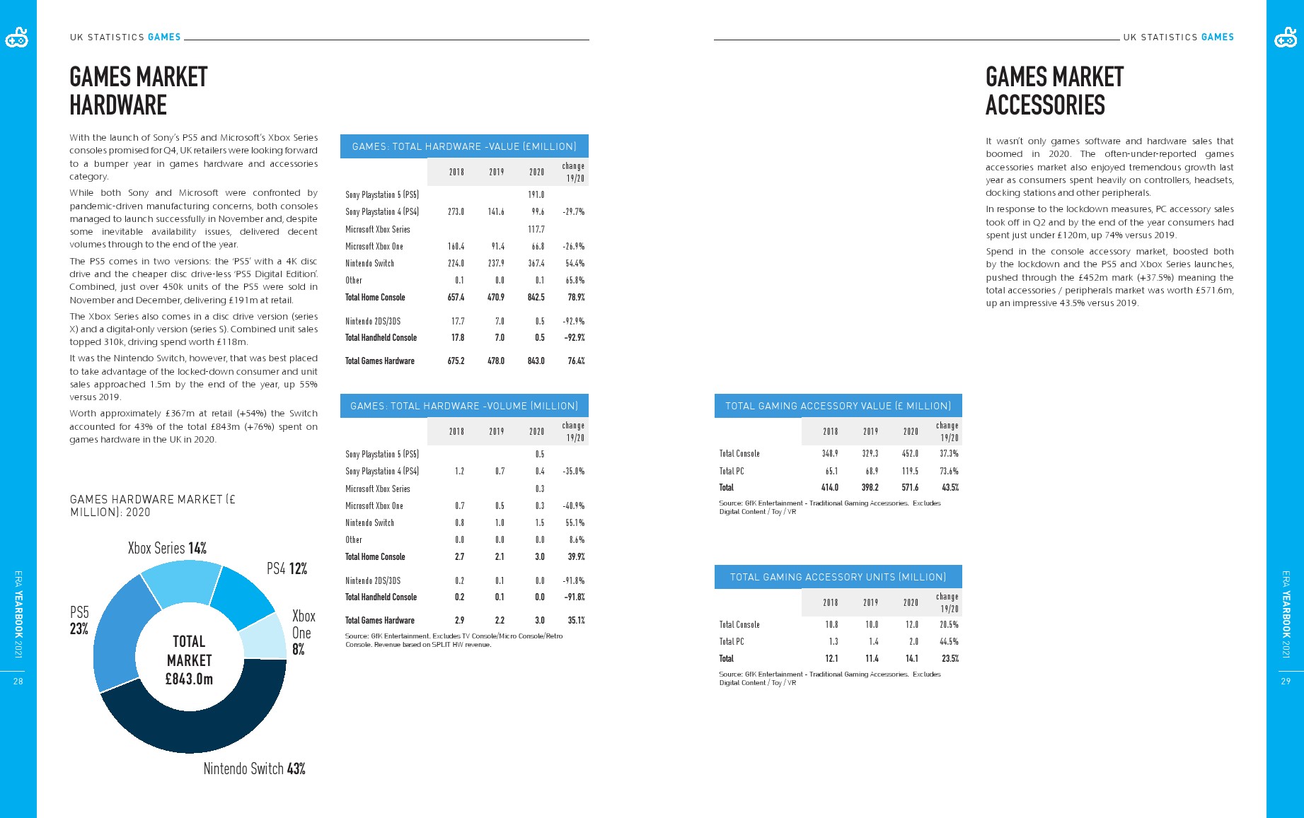 盒装游戏的销售从年初开始急剧下降,但在宣布封锁后的一周内出现了惊人的反弹。第三季度,英国从第一次封锁中恢复过来,孩子们重返学校,盒装游戏销售势头有所减弱。但在第四季度,索尼和Xbox推出了下一代游戏机,从而进一步推动了盒装游戏销售。