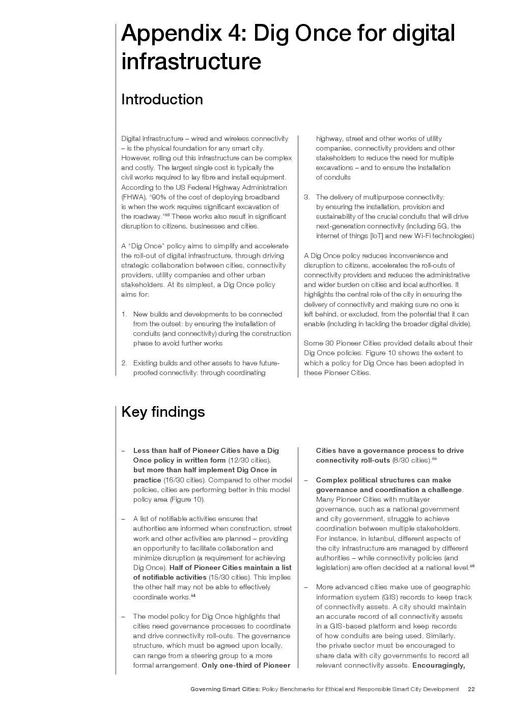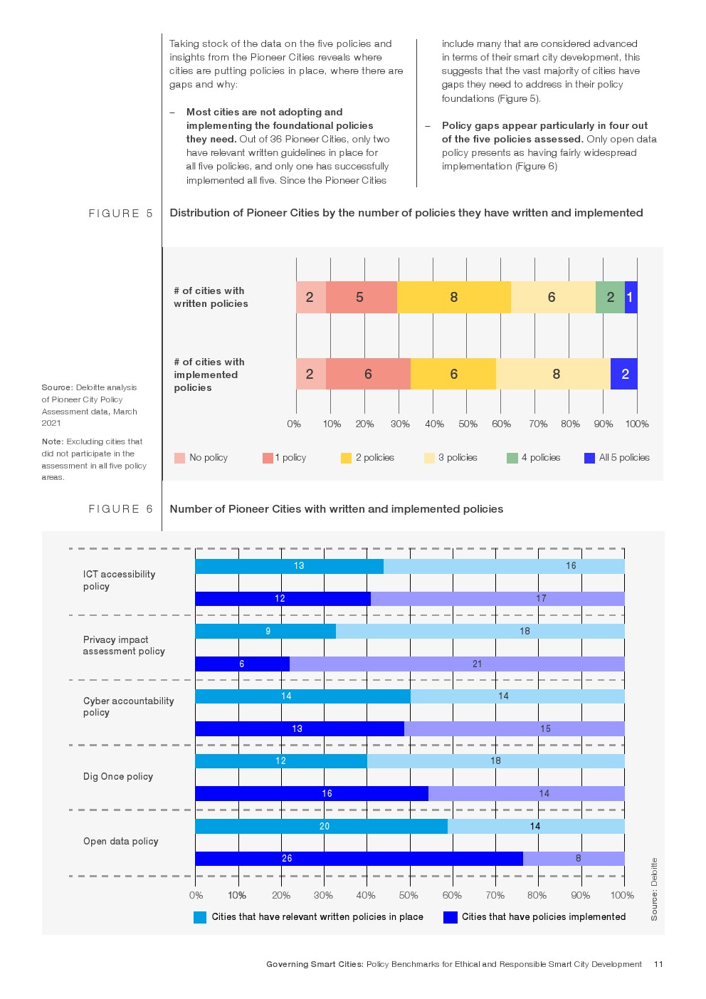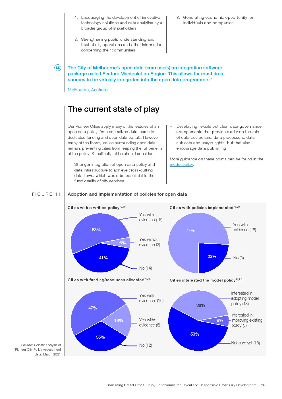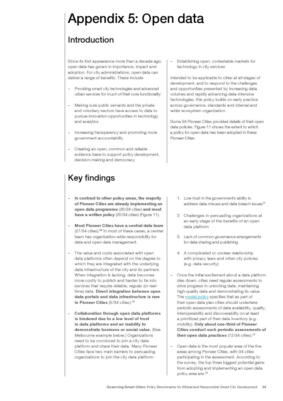–开放数据政策是大多数城市达到基本实施水平的唯一领域。只有15%的先驱城市将其开放式数据门户与更广泛的城市数据基础设施相结合,这是实现城市“默认开放”的必要步骤。