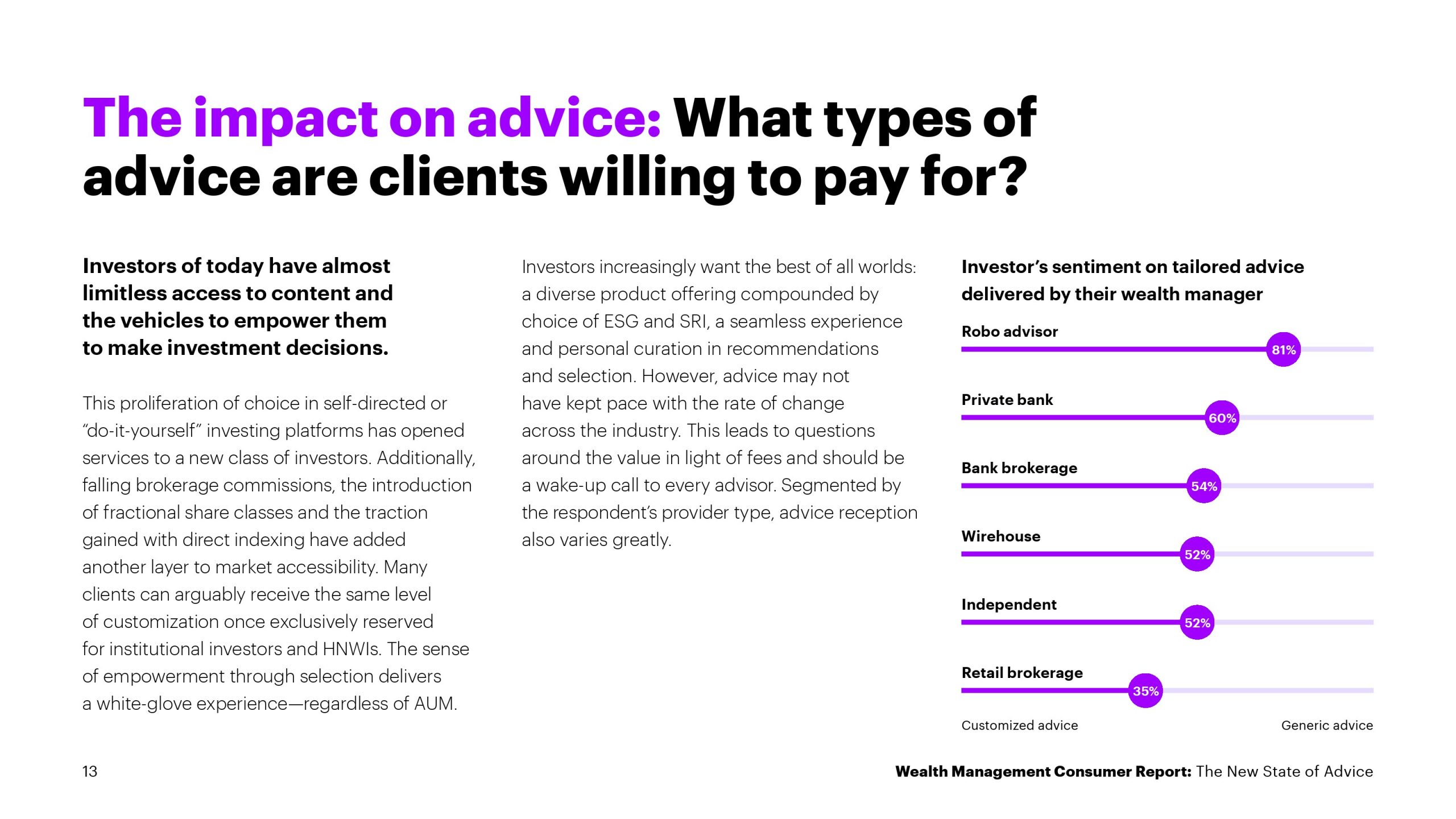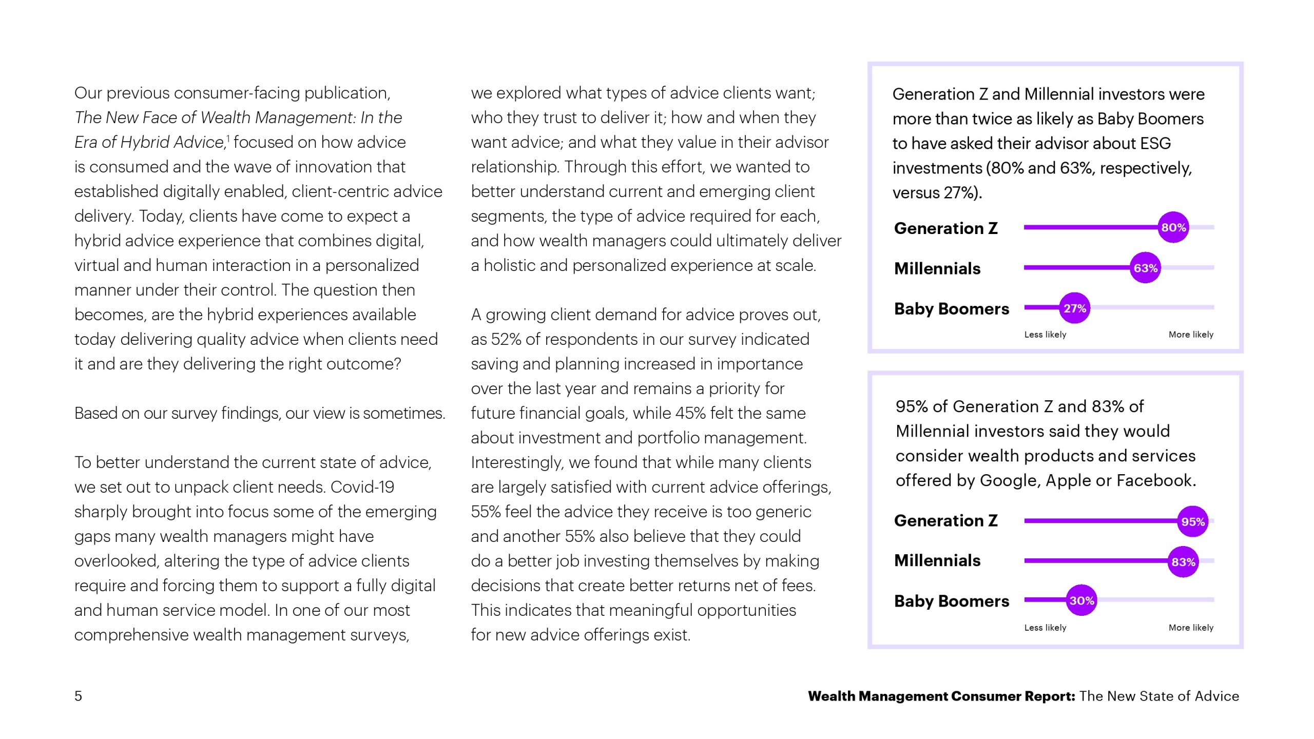 对于60岁以下的投资者来说尤其如此,他们的建议需求和偏好不同于婴儿潮一代。79%的受访投资者预计他们的顾问将提供银行和保险产品,但85%的X世代、91%的千禧一代和97%的X世代希望提供此类服务,而婴儿潮一代的为47%。