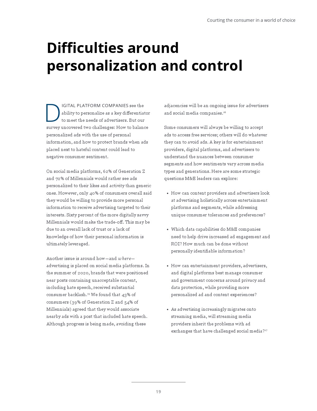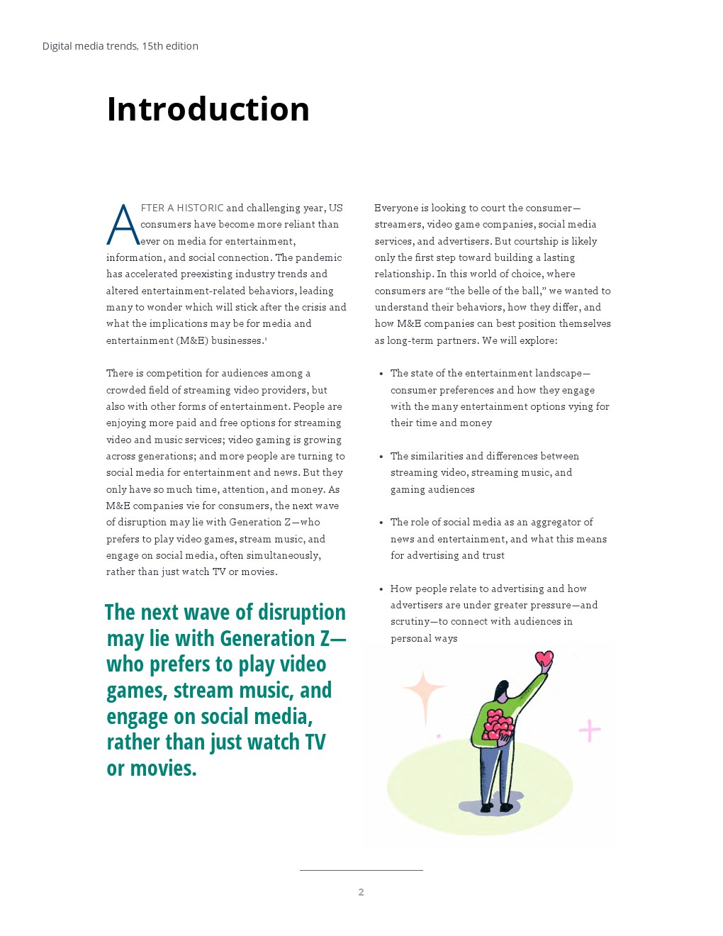 娱乐环境的状态,消费者的偏好以及他们如何打发时间,以及选择媒体的。流媒体视频、流媒体音乐和游戏受众之间的异同。社交媒体作为新闻和娱乐聚合器的作用,以及这对广告和信任的意义。人们是如何与广告互动的,广告主如何在更大的压力和审查下以个性化的方式与受众保持联系。