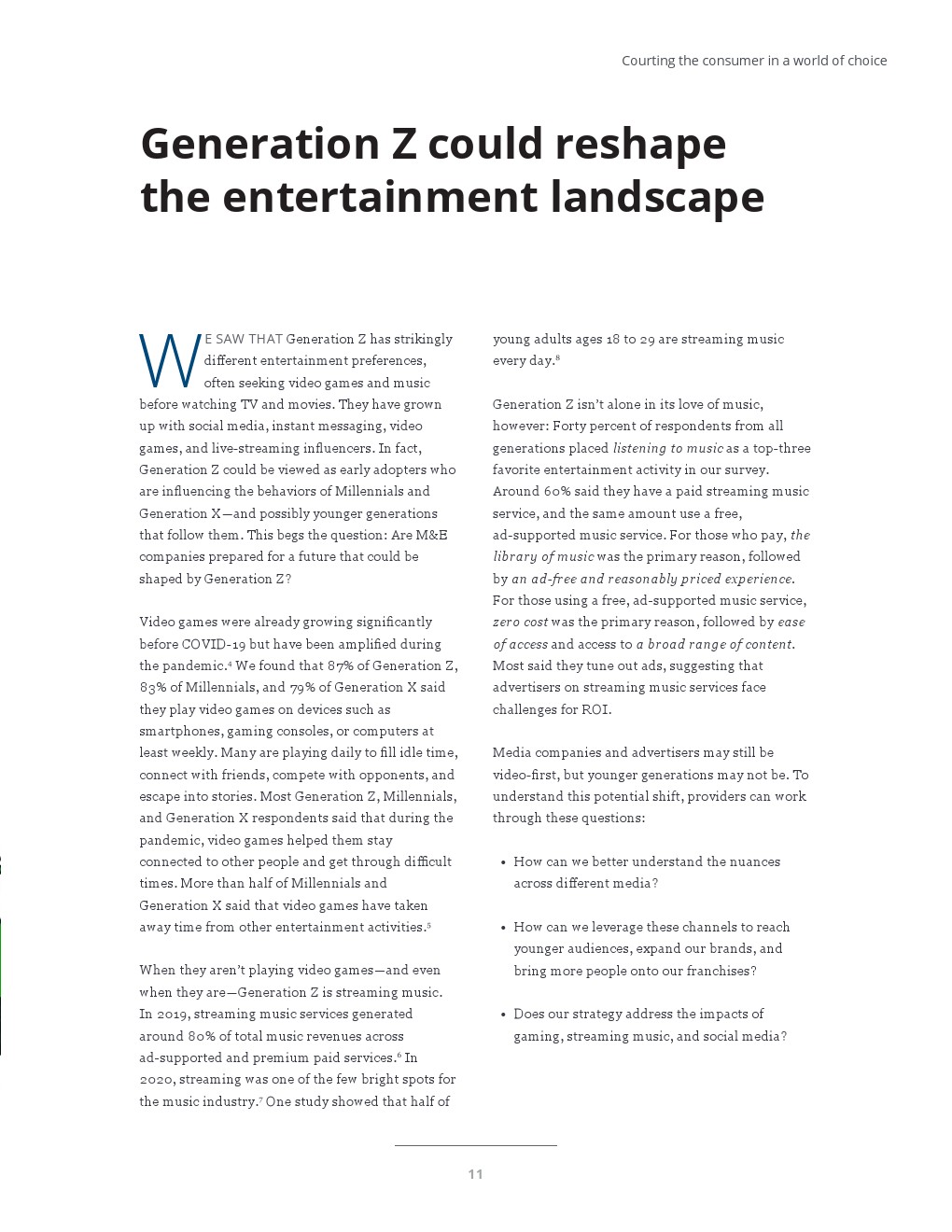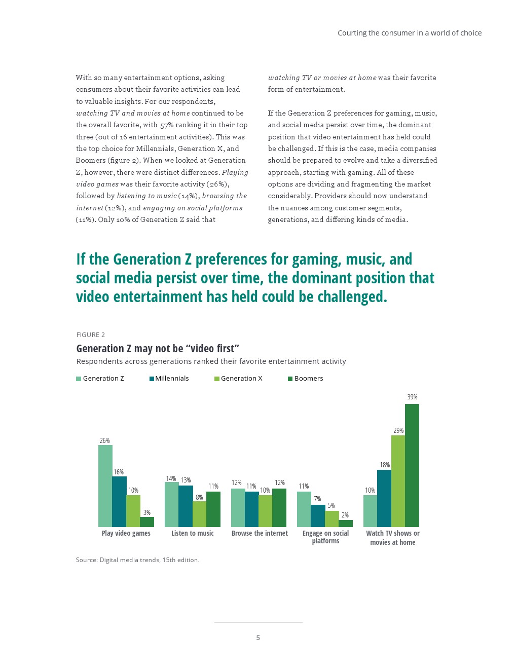 流媒体视频提供商之间存在着对观众的竞争,但也存在着其他形式的竞争。人们正在享受更多付费和免费的流媒体视频和音乐服务选择;视频游戏代代相传;越来越多的消费者转向社交媒体获取娱乐和新闻。但他们只有这么多的时间、注意力和金钱。随着 M&E 公司竞争消费者,下一波颠覆性浪潮可能聚焦 Z 世代。这一代人更喜欢玩视频游戏、访问流媒体音乐和社交媒体。而且这些行为通常是同时进行的。