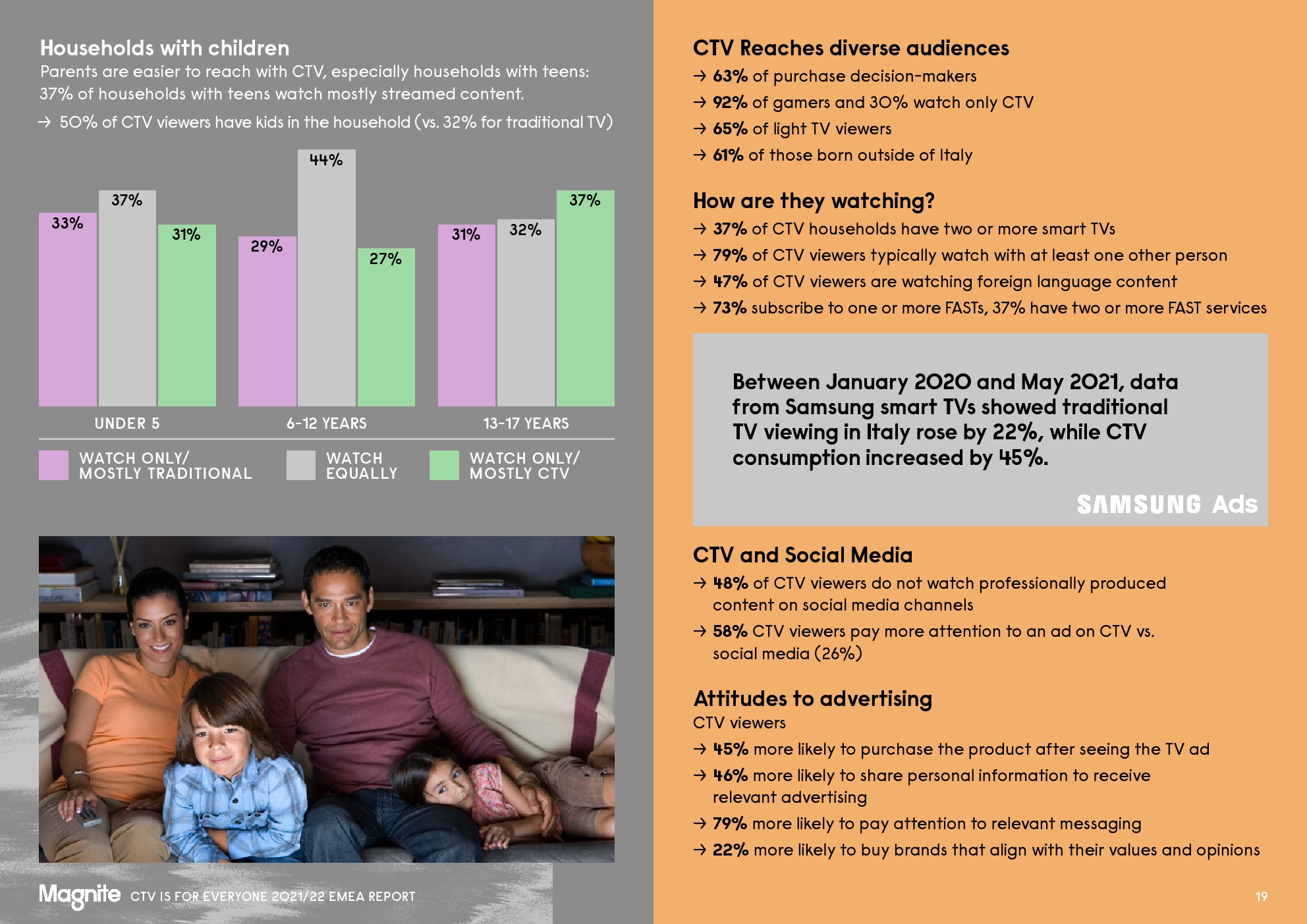 混合电视观看是新常态,71%的欧洲观众现在观看传统电视和CTV。30%的家庭主要看CTV提供的内容,只有22%的家庭只看传统电视。