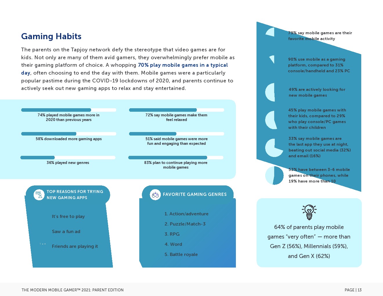 72%的父母表示手机游戏让他们感到放松。这是有道理的,大多数家长说手机游戏是他们最喜欢的移动活动,胜过社交媒体和信息/通信。