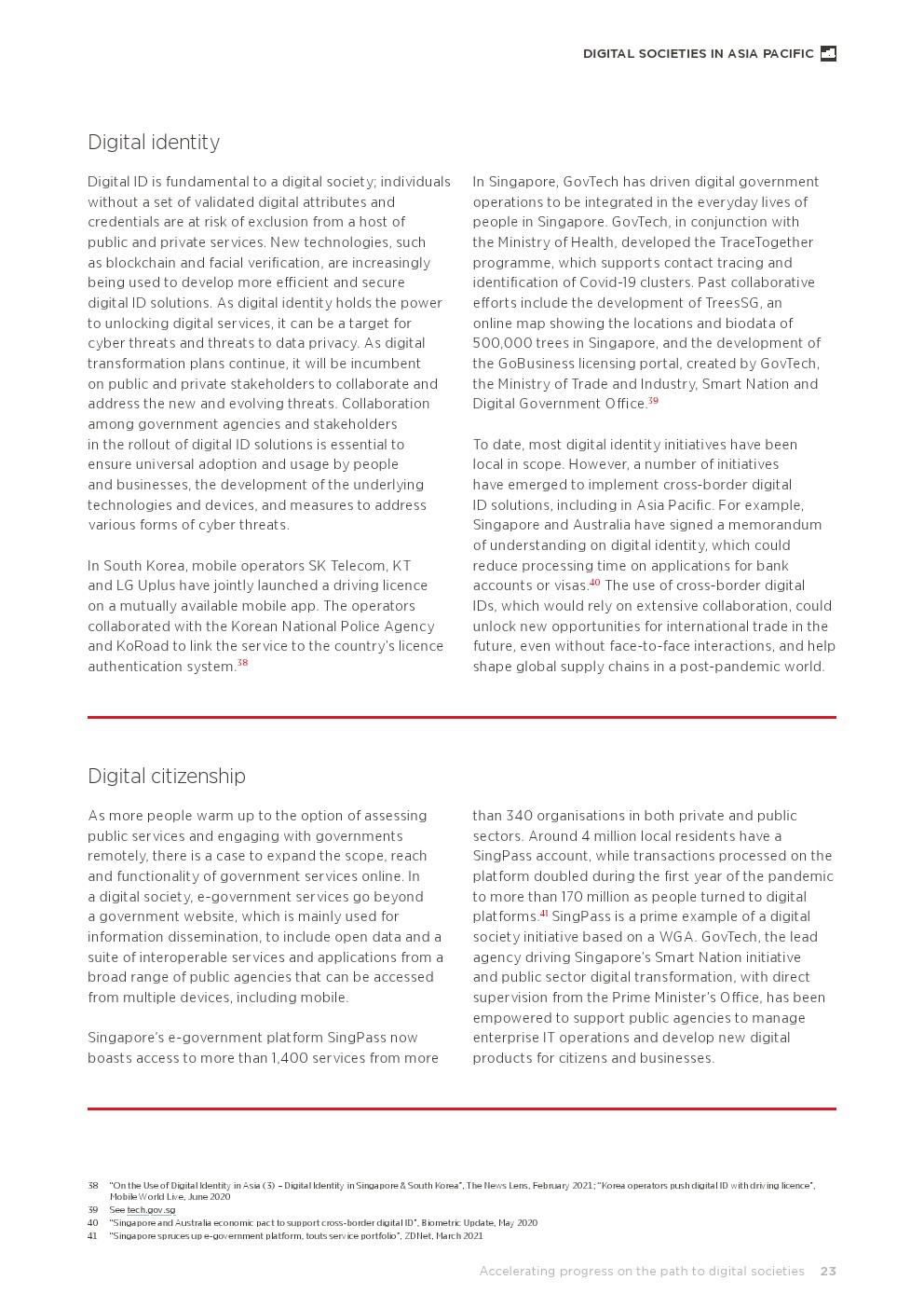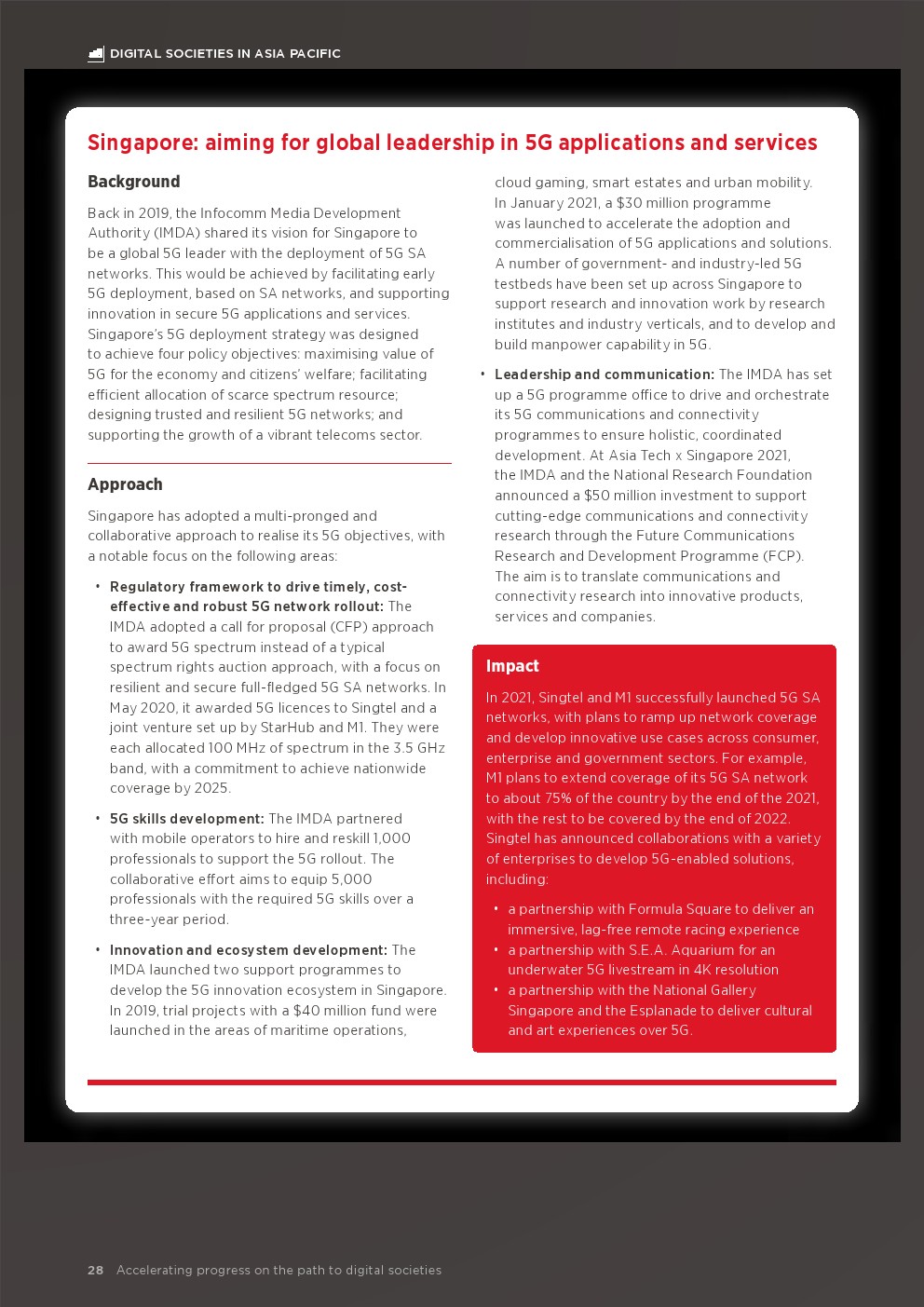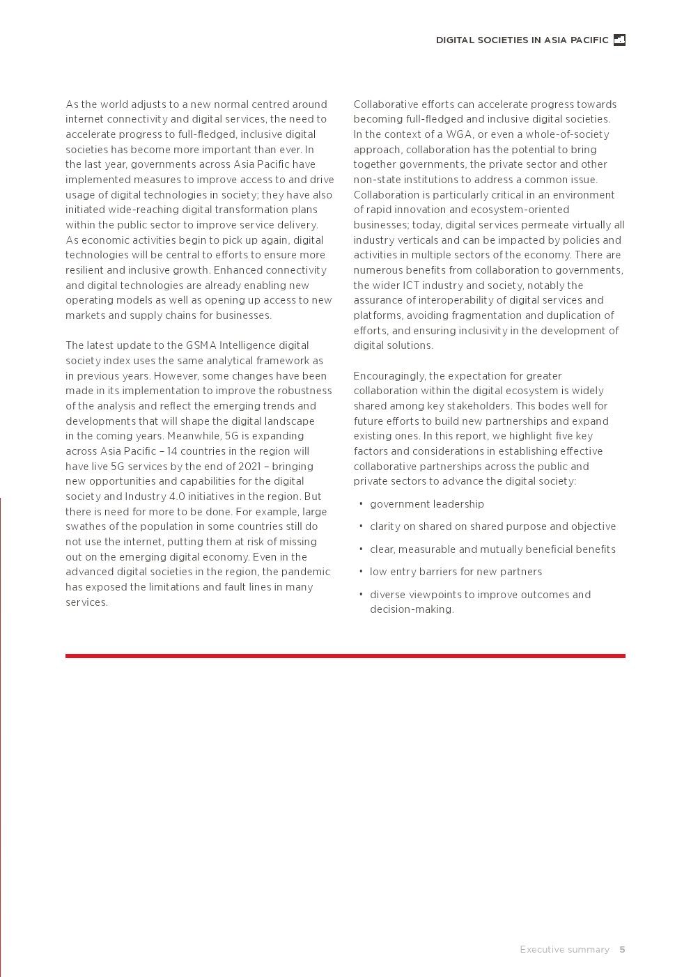 调查结果深入了解了合作努力在推动亚太地区数字社会发展方面发挥的作用。4G和5G允许人、地点和事物以前所未有的方式进行连接。随着创新的启动,来自不同行业的人们合作努力带来了多样化的想法,这有助于明确共同的目标。最终,这些努力可以降低障碍,建立繁荣的伙伴关系。整体政府方法(WGA)以及公私合作为该地区提供了跨越痛点的机会,并确保数字社会的好处得到广泛传播。