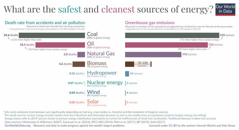 如今,化石燃料占世界能源产量的79%。它们具有非常大的负面影响,入下图所示,左边的条形图显示了死亡人数,右边的条形图比较了温室气体排放量。