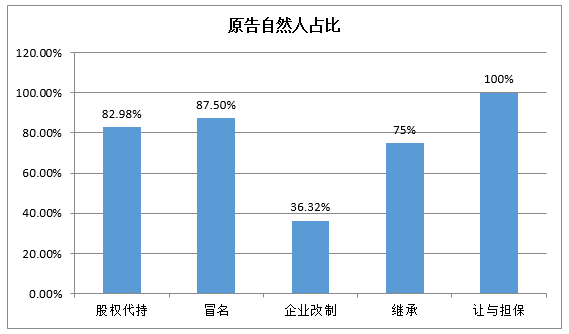关于自然人、企业作为原告的比例,自然人为63件,占67.02%,企业为31件,占32.98%。股权代持、冒名、继承、让与担保的原告为自然人的占比较高。