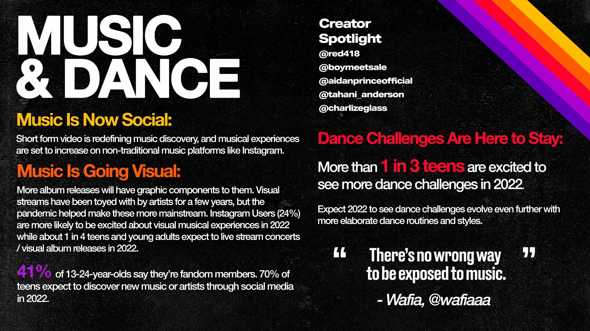 更多专辑发行将包含图形组件。艺术家已经使用视觉流好几年,但新冠大流行帮助这些作品变得更加主流。Instagram用户(24%)在2022年更有可能对视觉音乐体验感到兴奋,大约1/4的青少年和年轻人希望在2022年现场收看音乐会。