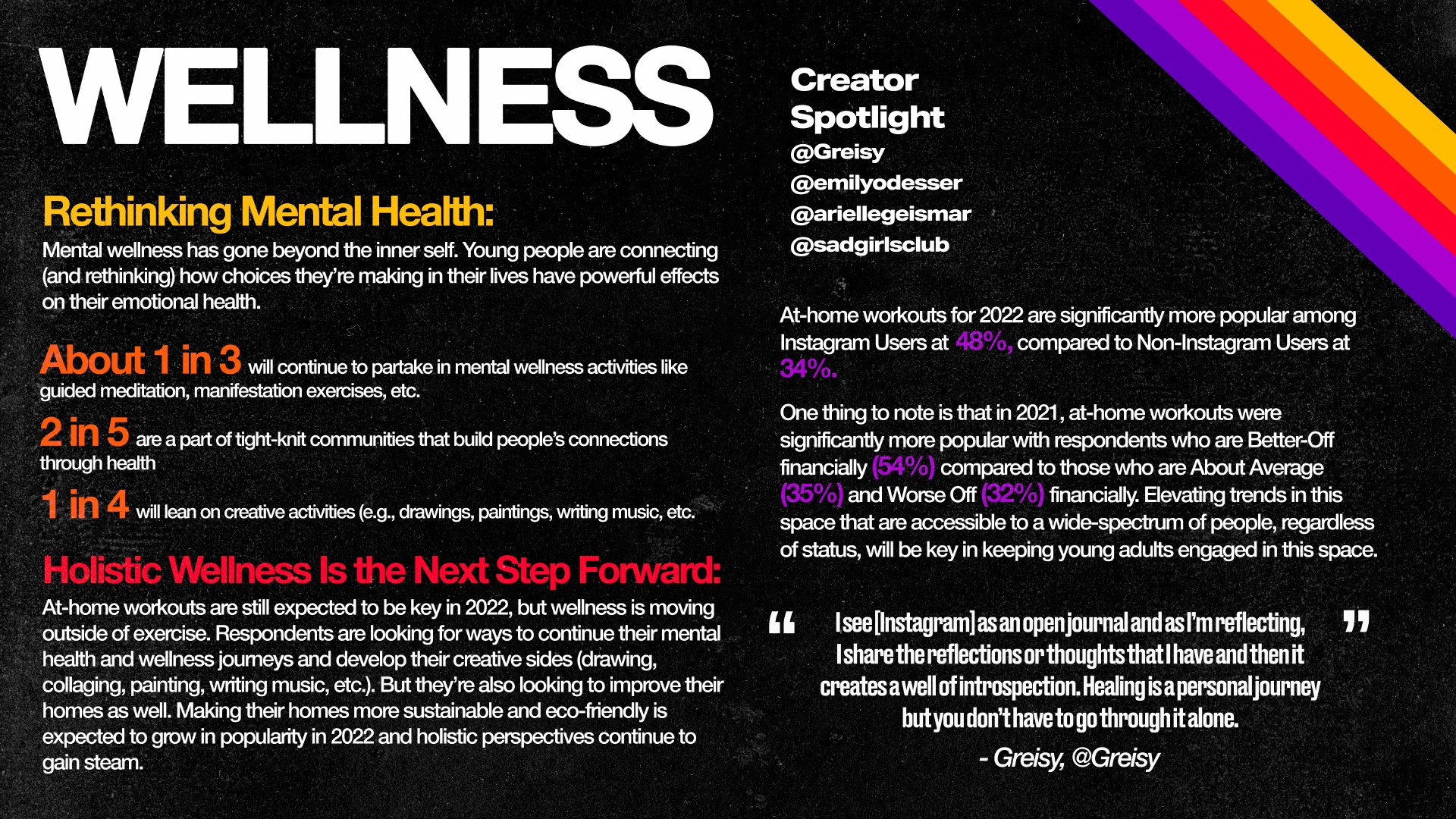 心理健康已经超越了内在自我。大约1/3的人继续参加心理健康活动,如引导冥想、表现练习等。