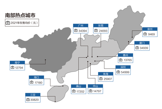 2021年华北东北地区新房在售均价为14438元/㎡,同比微跌0.3%,华东地区均价为18875元/㎡,同比微涨0.1%,华南地区均价为4个区域最高,达到24197元/㎡,环比上涨1.5%,中西部地区均价环比下跌1.3%至12273元/㎡。