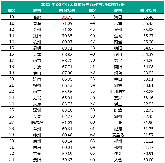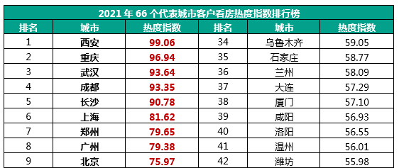 从2021年重点66城客户看房热度指数排行榜来看,热度排名前十的城市分别是西安、重庆、武汉、成都、长沙、上海、郑州、广州、北京、合肥,基本为一二线城市,一线城市中深圳是唯一一个不在前十的城市,其中西安热度排名第一,2021年新房市场整体偏热,供不应求,其次为重庆,热度排名第二。