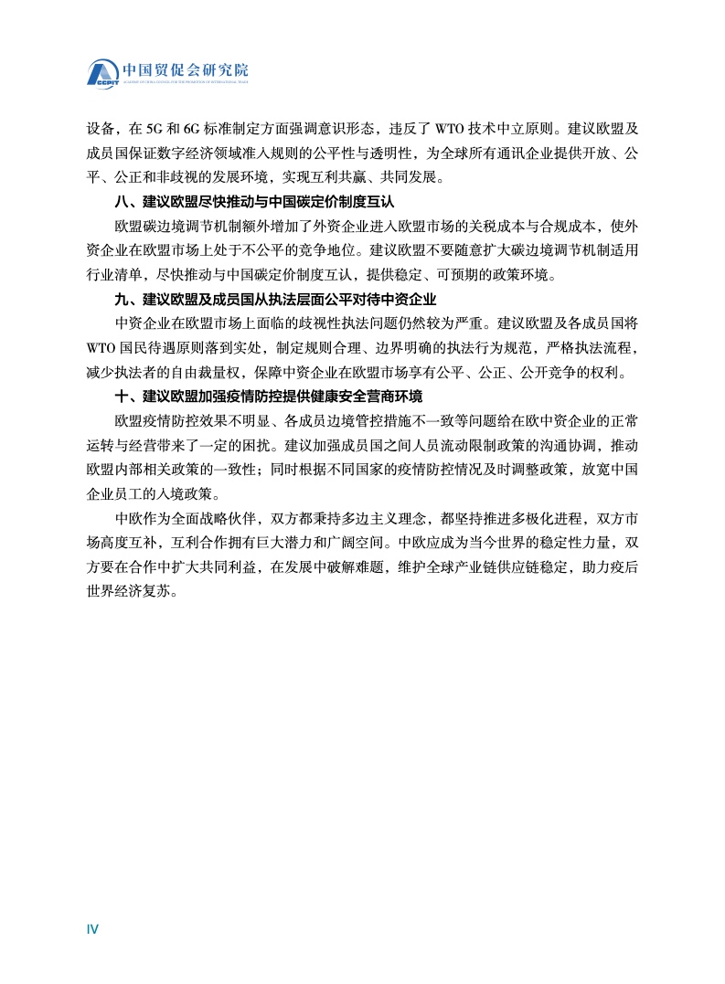 《报告》建议,继续坚定贸易自由化和多边主义的立场,重启中欧投资协定批准程序,放宽外资进入欧盟市场的限制,谨慎使用外国补贴审查工具,保障中资企业公平参与公共采购,推动与中国碳定价制度互认,从执法层面公平对待中资企业,加强疫情防控等措施,可帮助欧盟重塑良好的营商环境,提升中资企业对欧盟投资的信心。