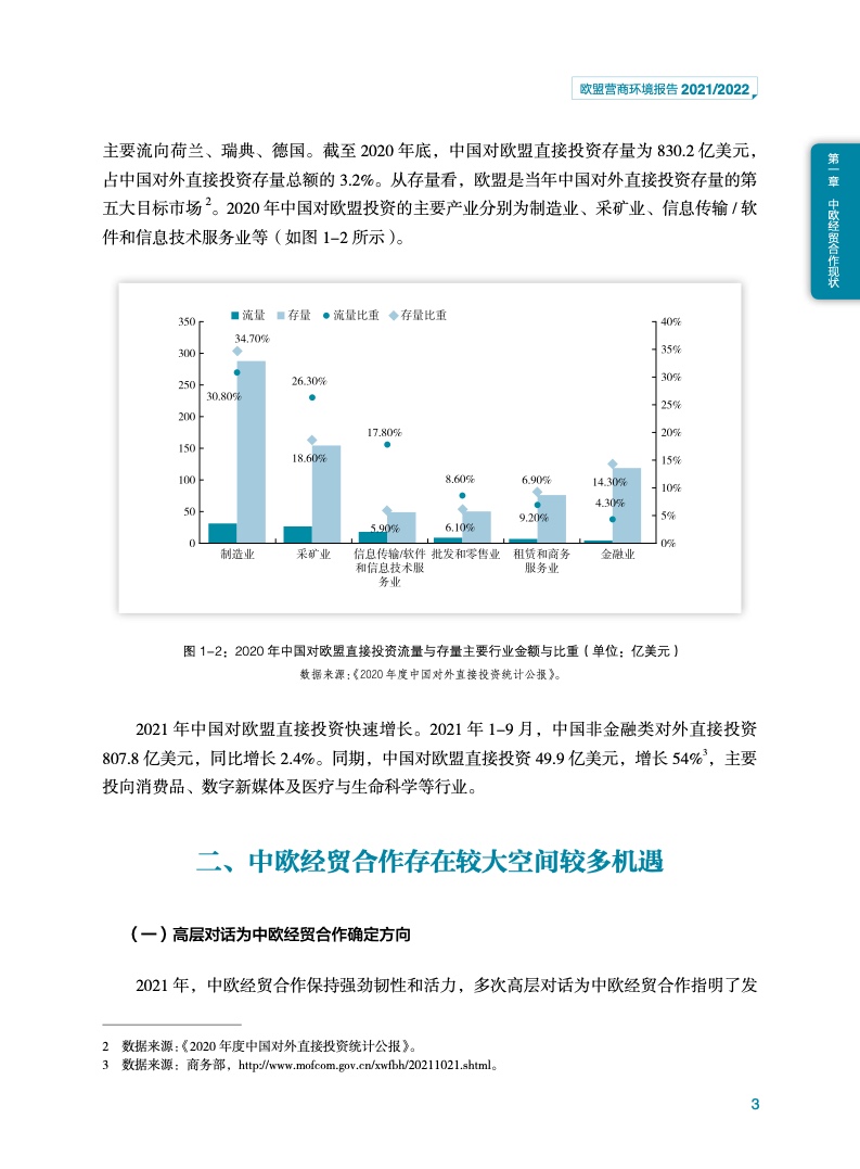 《报告》显示,新冠肺炎疫情反复延宕,世界经济复苏缓慢,但是中欧双边贸易投资规模逆势上扬、增长迅速。截至2021年11月,中欧双边货物贸易总额为7476.33亿美元,同比增长29.2%。中国是欧盟第一大贸易伙伴,欧盟为中国第二大贸易伙伴。2021年1-9月,中国对欧盟直接投资49.9亿美元,增长54%。