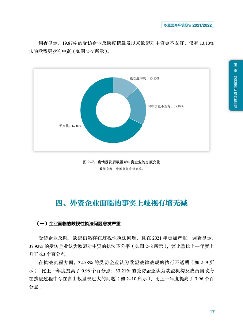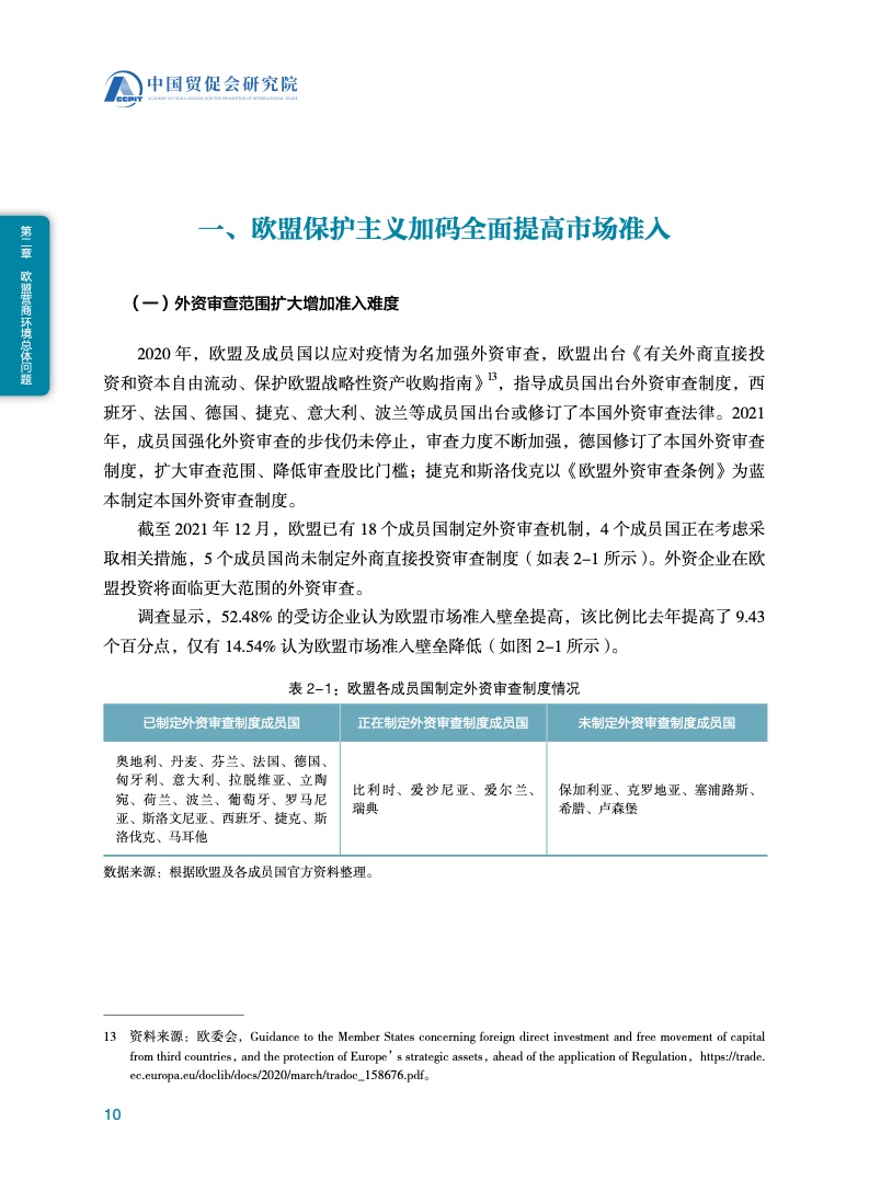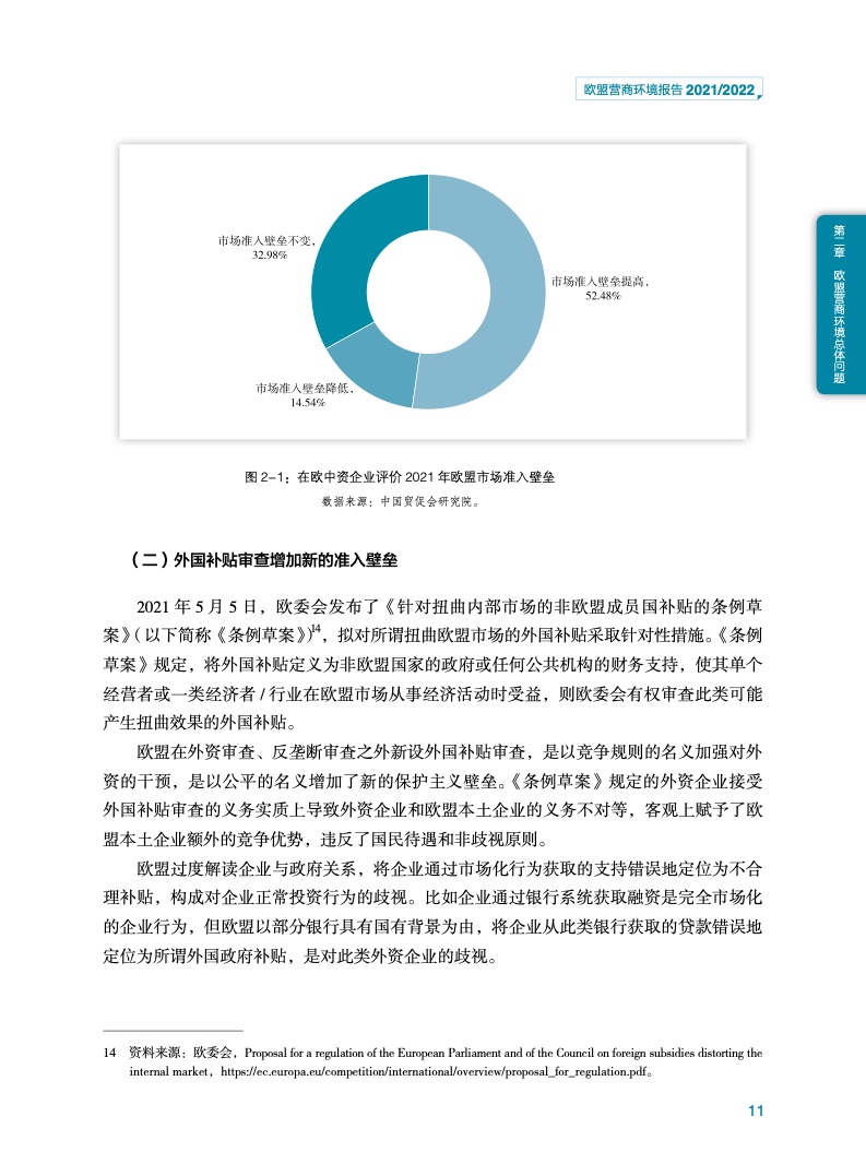《报告》认为,欧盟的营商环境仍有待改善,例如在外资审查、外国补贴审查、公共采购审查等方面市场准入壁垒较高,给与欧盟开展贸易投资合作的中国企业造成不利影响。