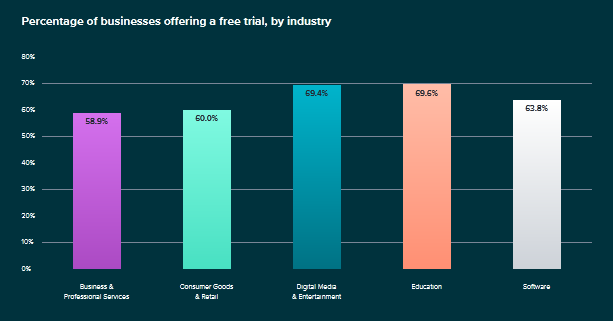 按行业划分,数字媒体和娱乐(69.4%)和教育(69.6%)企业提供免费试用订阅的份额高于平均水平。此外,B2C 企业比 B2B更有可能提供免费试用,分别为 68.7% 和 64.2%。