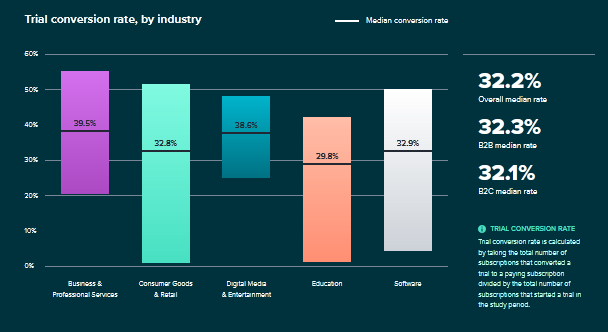 数字媒体和娱乐业务的中位试用转化率(38.6%)远高于总体(32.2%)。在试用转化率方面,B2B(32.3%)和 B2C(32.1%)之间几乎没有差异。