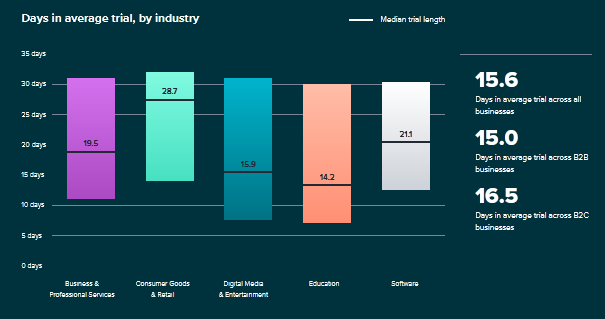 平均而言,免费试用期略高于2周(15.6天)。消费商品和零售公司提供接近一个月(28.7天)的试用期,而软件企业的平均试用期为3周(21.1 天)。