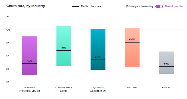 数据表明,所有订阅业务的中位流失率为4.4%。消费品和零售(7.1%)、教育(6.6%)和数字媒体和娱乐(5.4%)订阅业务的流失率最高,而软件(3.7%)的流失率最低。