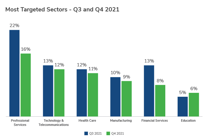在本季度,专业服务部门是攻击的最大目标,其次是技术/电信、医疗保健、制造业、金融服务和教育部门。