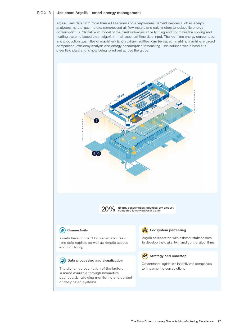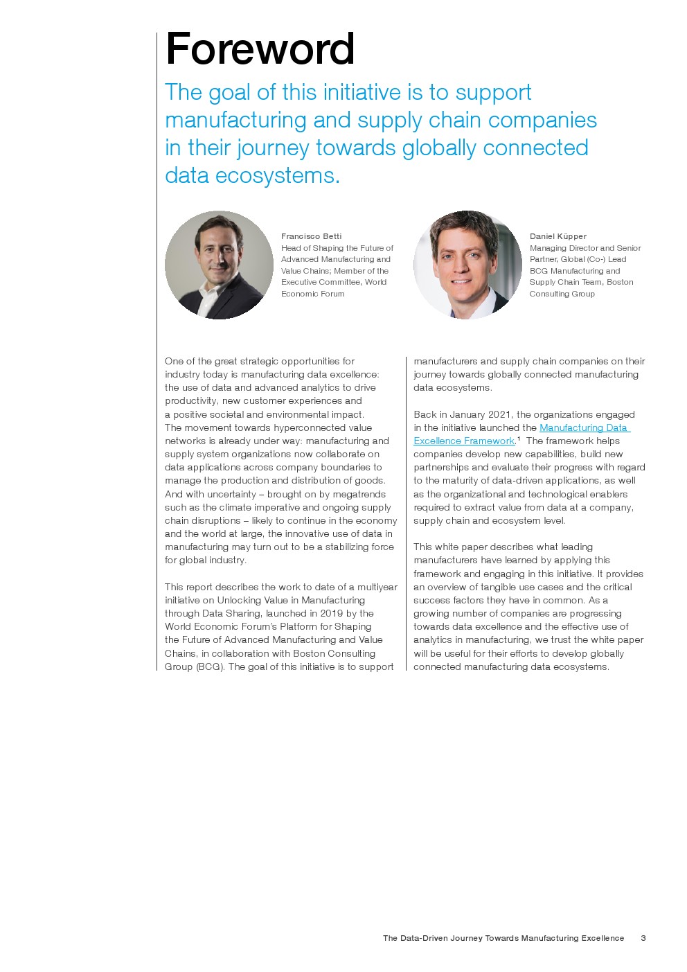 为了利用数据的力量,“通过数据共享释放制造价值”倡议的成员共同开发了实现数据卓越框架,该工具可识别数据驱动应用程序的价值机会以及构建所需的技术和组织推动力。2021年,几家领先的制造商通过对其设施进行自我评估来应用该框架,以便更好地了解他们的数据成熟度以及可以采取哪些步骤来达到新的水平。