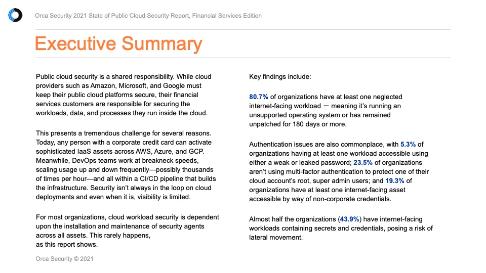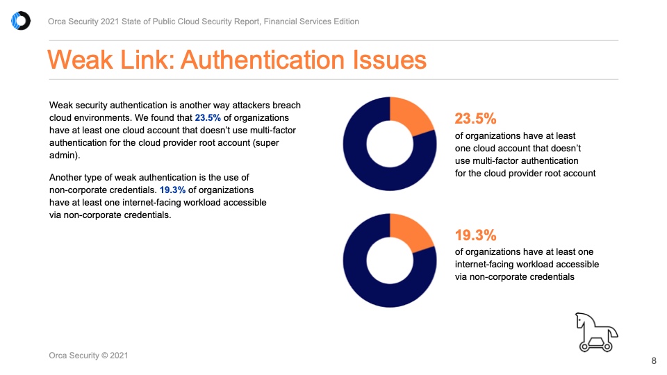 身份验证问题也很常见,5.3%的企业至少有一个工作负载可通过弱密码访问或密码已泄露;23.5%的企业没有使用多因素身份验证来保护其云帐户的超级管理员用户;19.3%的企业至少有一项面向互联网的资产可通过非公司凭证访问。