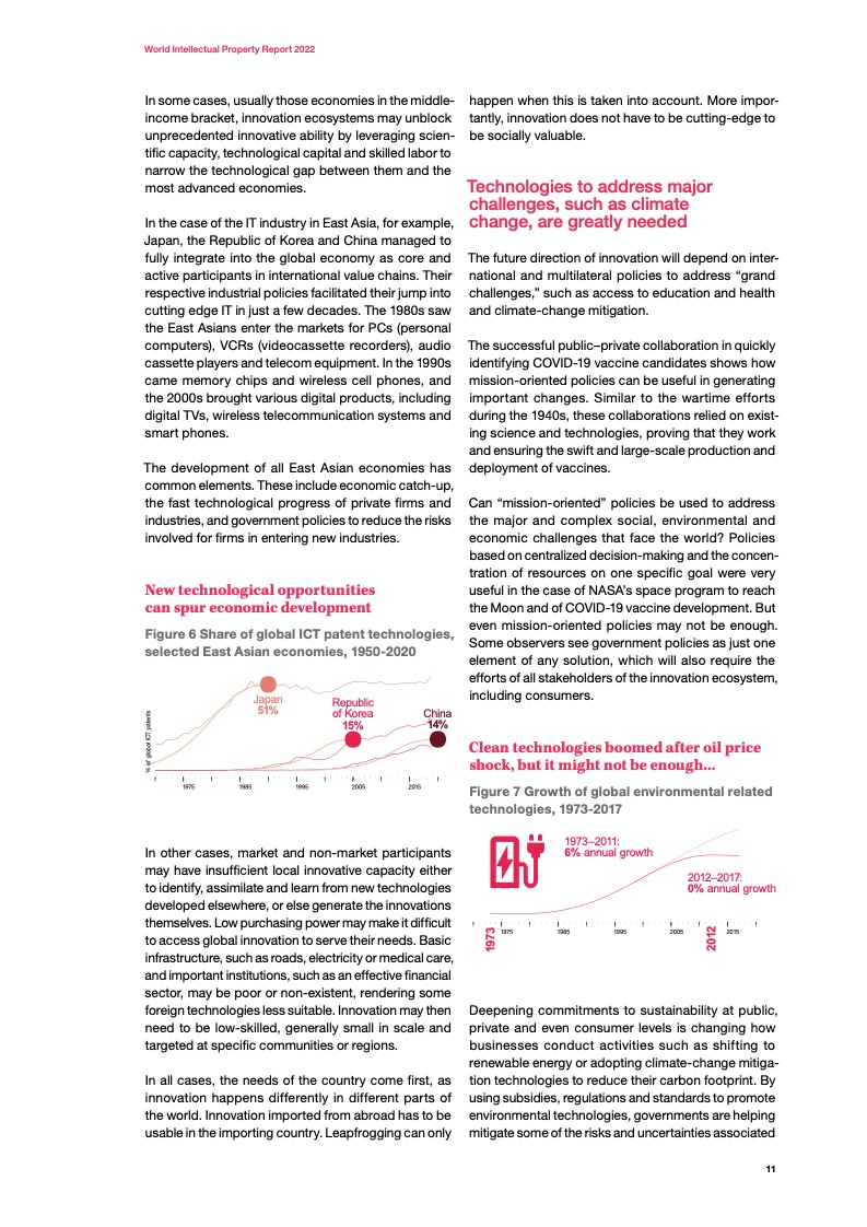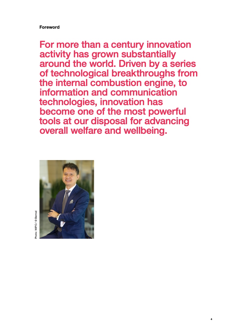 知识产权组织总干事邓鸿森说:“这份重要的报告有助于我们了解每个人需要做什么来确保人类的聪明才智得到有效的利用和引导,并对我们共同面临的一系列全球挑战,特别是气候变化,产生最大的影响。”