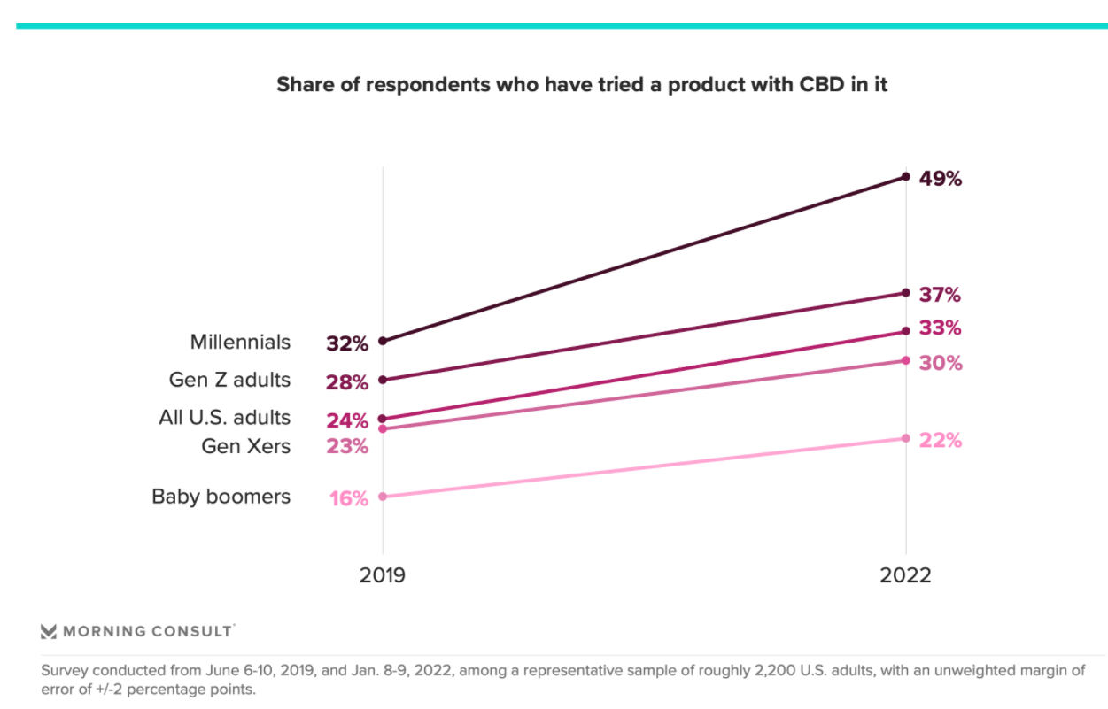 1/3的美国成年人和一半的千禧一代尝试过CBD产品