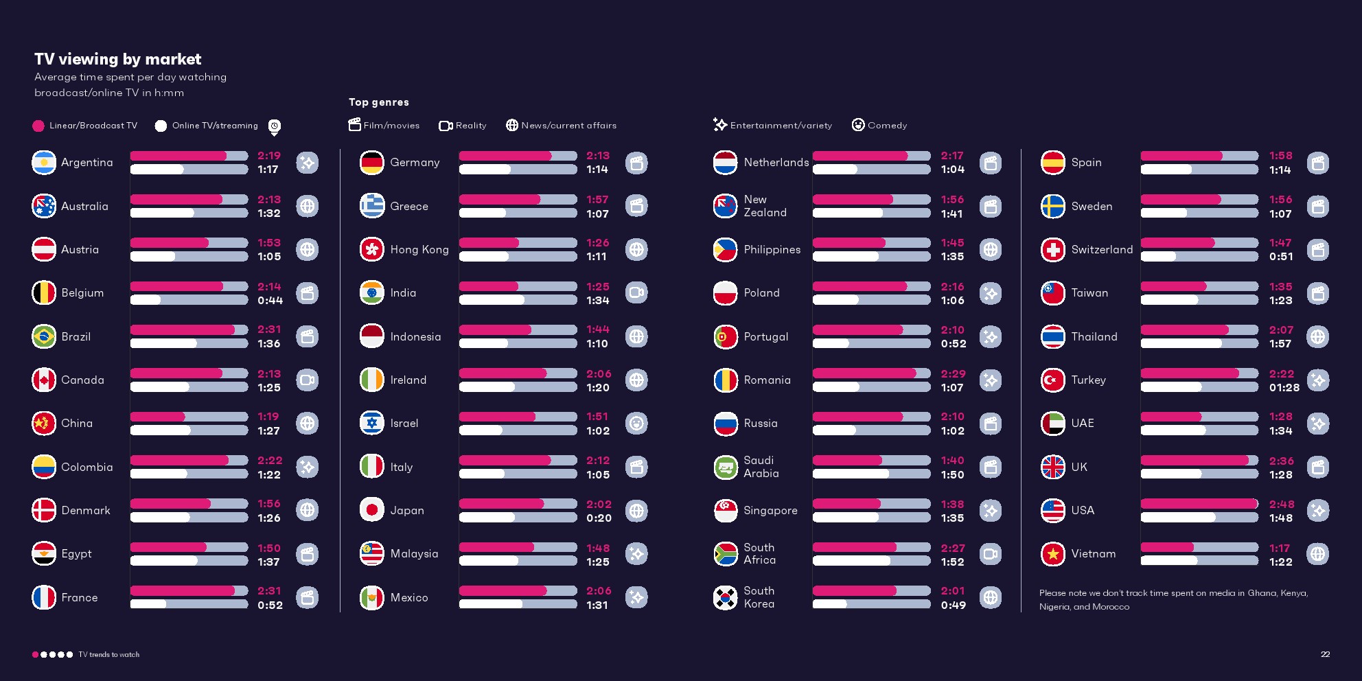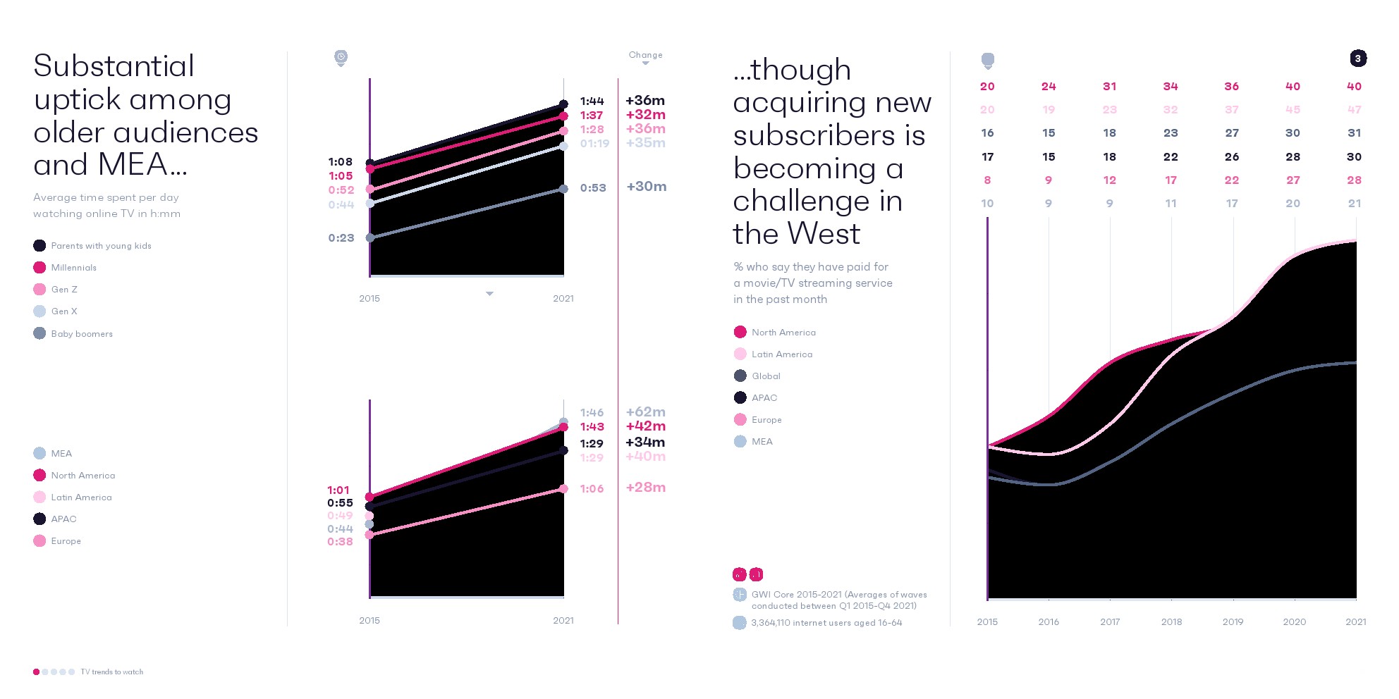 大流行加速了在线电视收视,2020年全球消费者平均每天花1小时 26分钟观看流媒体。但人们观看传统电视的平均时间仍然比在线电视多了25分钟。
