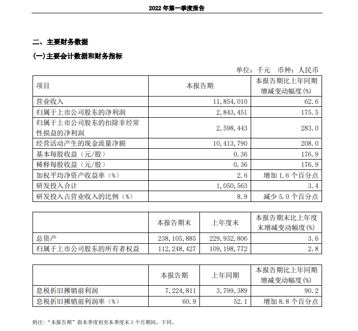 近日,A股芯片一哥——中芯国际发布一季度业绩公告,2022年一季度实现营收118.54亿元,同比增长62.6%;归属于上市公司股东的净利润28.43亿元,同比增长175.5%。基本每股收益0.36元,业绩增长主要是由于产品组合变化、价格调整及出货量增加所致。