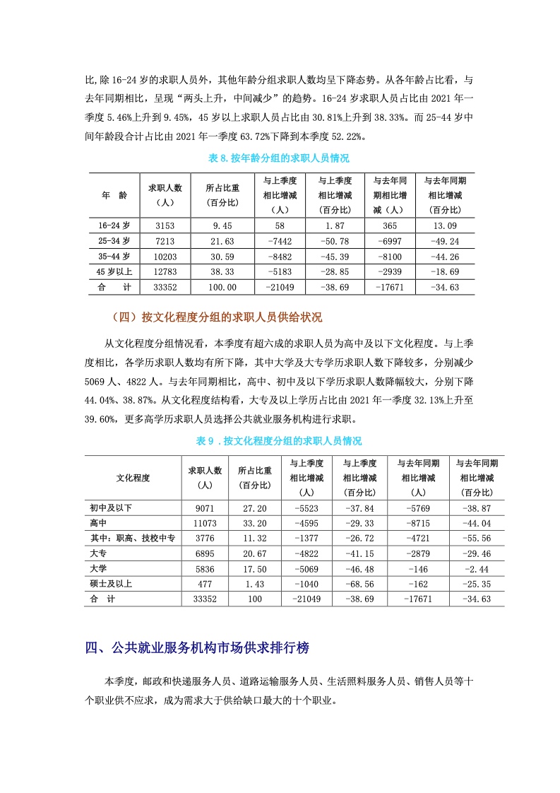 1.从供求总体情况看,市场进入求职淡季,用人需求较上季度有所回暖。本季度,求职 总量较上季度减少 2.1 万人,下降 38.69%;用人需求较上季度增加 9.5 万人,增长 126.57%。 与去年同期相比,供求总量呈现“双降”态势,求职总量同比减少 34.63%,需求总量同比 减少 11%。