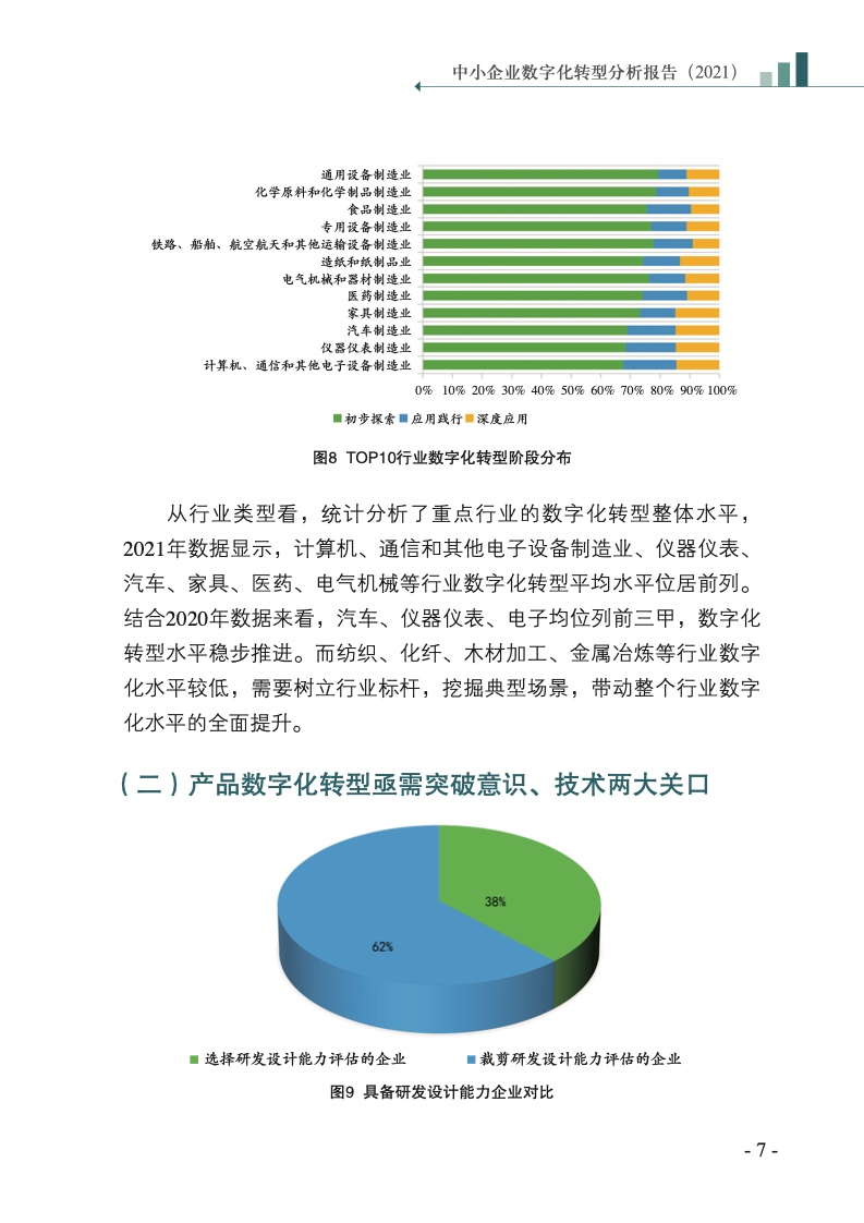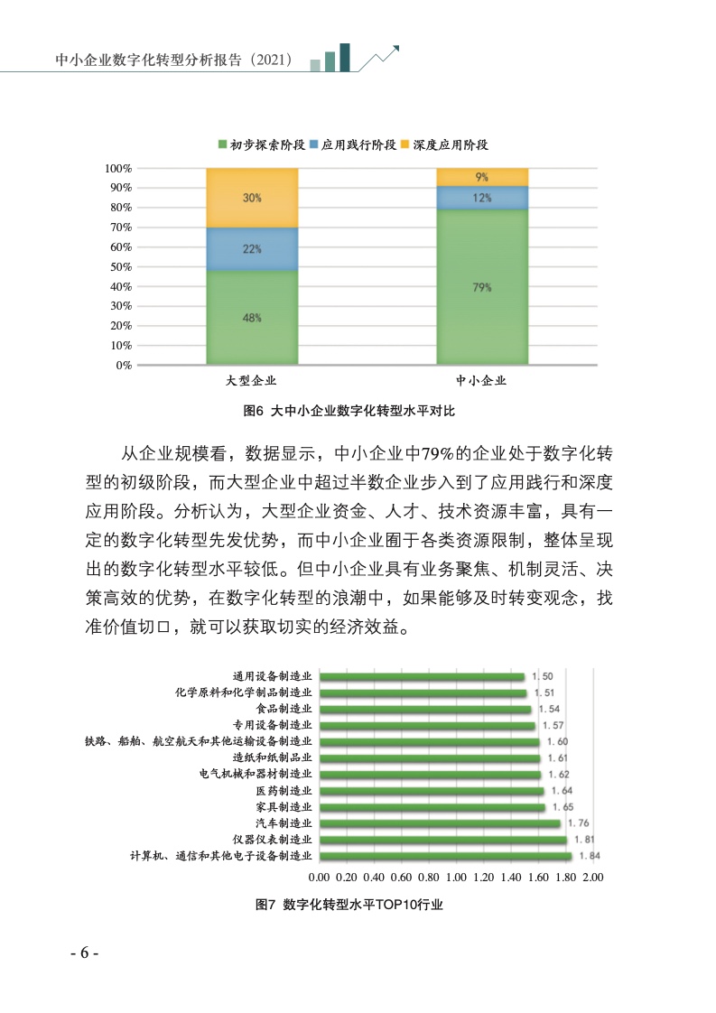 从整体情况看,数据显示,2021年处于初步探索的企业占比为79%,相较于2020年下降了10个百分点,处于应用践行阶段的企业占比为12%,相较于2020年增长了4个百分点,达到深度应用阶段的企业占比为9%,相较于2020年增长了6个百分点。