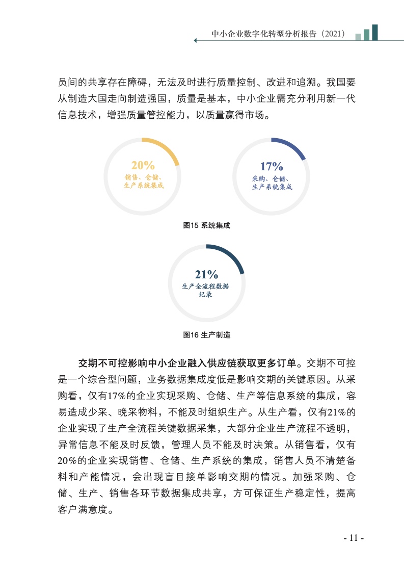 中国电子技术标准化研究院牵头制定了《中小企业数字化转型指南》标准,基于15000余家中小企业数据,编制形成《中小企业数字化转型分析报告(2021)》,分析中小企业数字化转型的整体态势,从业务转型、管理转型、产品转型的三重视角剖析转型进展、成效与不足,并在此基础上,提出未来展望,以期为社会各界提供参考。