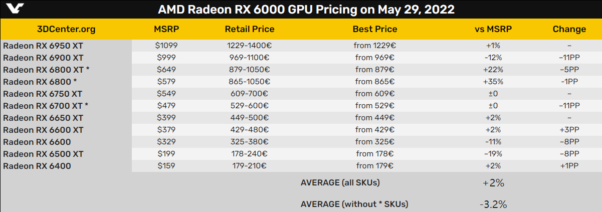 3DCenter公布了2022年度第八次德国与奥地利显卡市场价格统计,一方面欣喜地看到整体价格还在稳定、持续走低,已经无限接近原价,但另一方面也不由得让人感慨,下一代都要来,这一代还这么贵!截至当地时间5月29日,AMD RX 6000系列显卡的平均溢价幅度只剩下了2%,相比去年底跌去了81个百分点,相比一年前的峰值更是降了214个百分点。