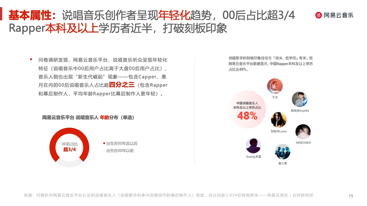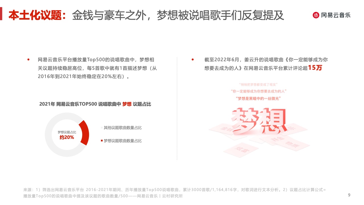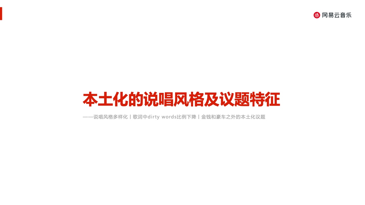 作为广受年轻用户青睐的音乐社区,网易云音乐对这一趋势保持了持续的关注。自2020年起,说唱已成为网易云音乐播放量第二的曲风(仅次于流行 音乐),也是热度最高的分众音乐类型。本报告力图基于网易云音乐平台数据,并依托歌词文本分析、问卷调研、深度访谈等方法,还原中文说唱音乐 一部分真实现况,给相关从业者以参考与启发。