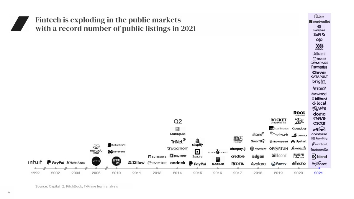 金融科技初创公司正在以越来越快的速度退出公开市场,市场正在以更高的收入倍数和估值回报他们。2021 年 77 家金融科技公司退出上市,估值接近 4000亿美元。这使公共金融科技公司的市值在 2021 年第三季度超过了 1.3 万亿美元。