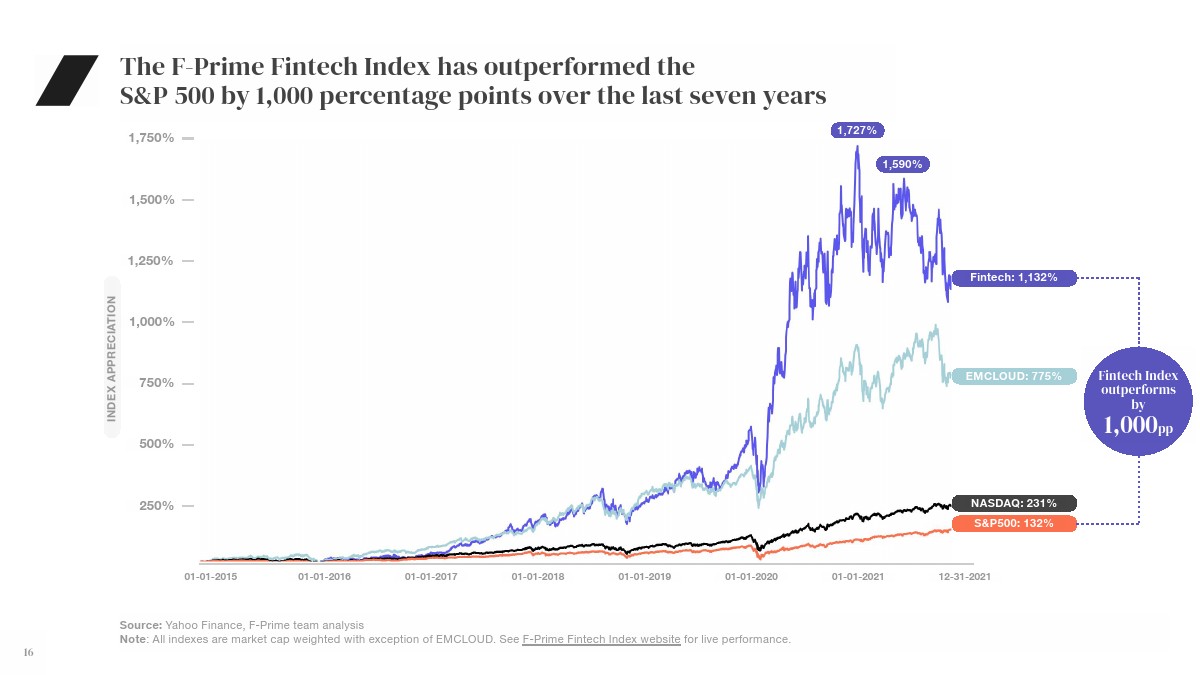 在过去十年,支付初创公司吸引了最多的金融科技投资,高达1180多亿美元,按市值计算占 F-Prime 金融科技指数的 74%。