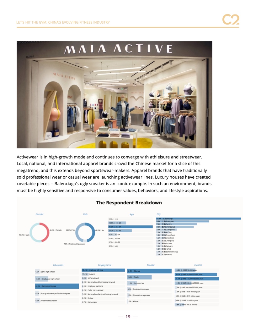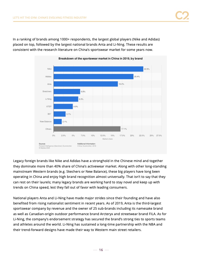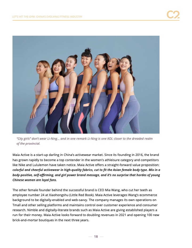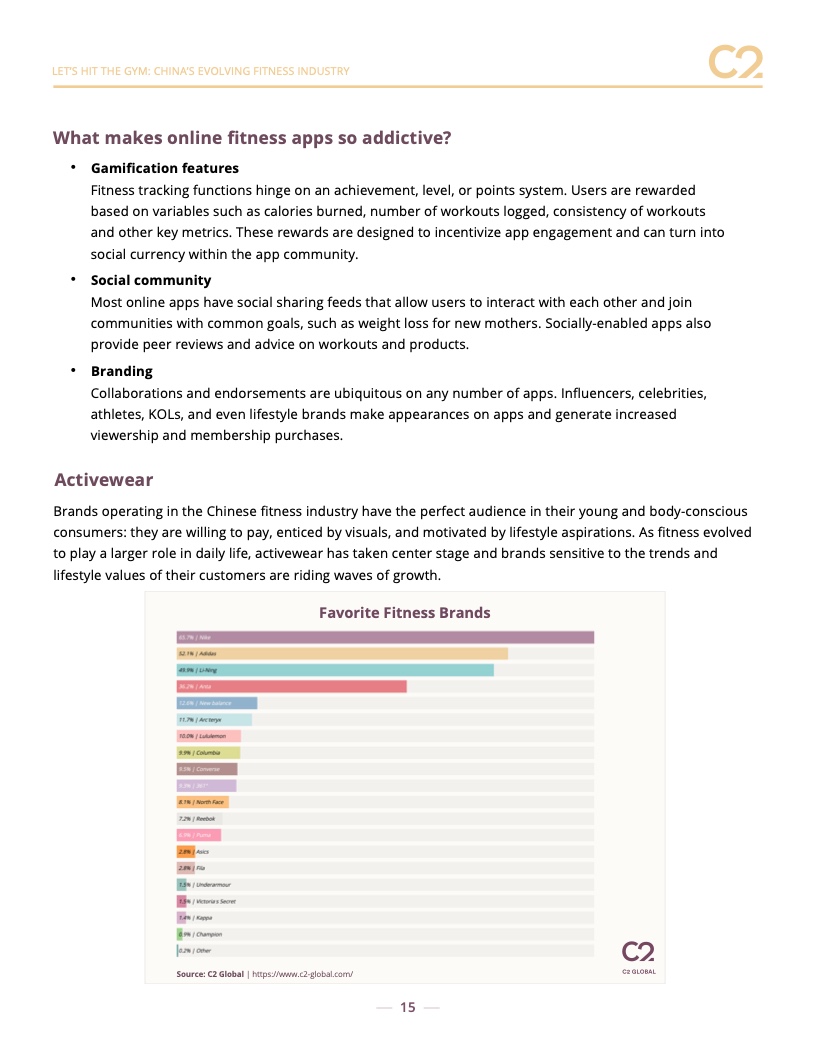 顶级健身品牌由中国最大的品牌引领:耐克、阿迪达斯、李宁和安踏。但是,我们也看到了对户外和专业品牌的大力支持,包括 New Balance、Arc’teryx、Lululemon 和 Columbia。预计新的和创新的品牌将继续受到欢迎,包括 Maia Active 等中国品牌。