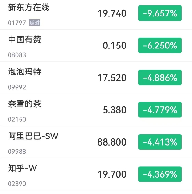 新浪科技讯 8月8日下午消息,香港恒生指数收跌0.77%,恒生科技指数跌1.82%。新东方在线跌超9%,有赞跌超6%,泡泡玛特、奈雪、阿里巴巴、知乎、蔚来跌超4%,新东方跌超3%。