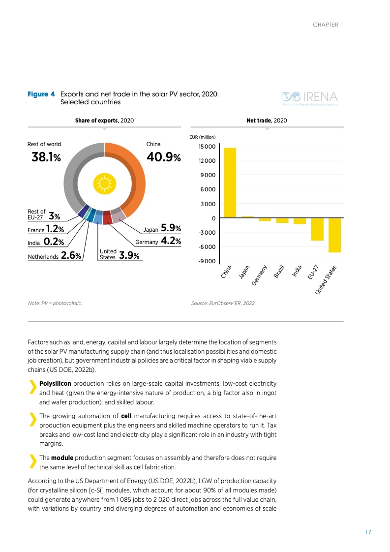 报告强调了一些值得注意的区域和国家发展情况。东南亚国家正逐步成为主要的太阳能光伏制造中心和生物燃料生产国。中国是太阳能光伏板制造及安装大国,并且正在为海上风电创造越来越多的就业机会。印度的太阳能光伏新增容量超过10吉瓦,提供了很多安装工作岗位,但仍然严重依赖进口太阳能板。