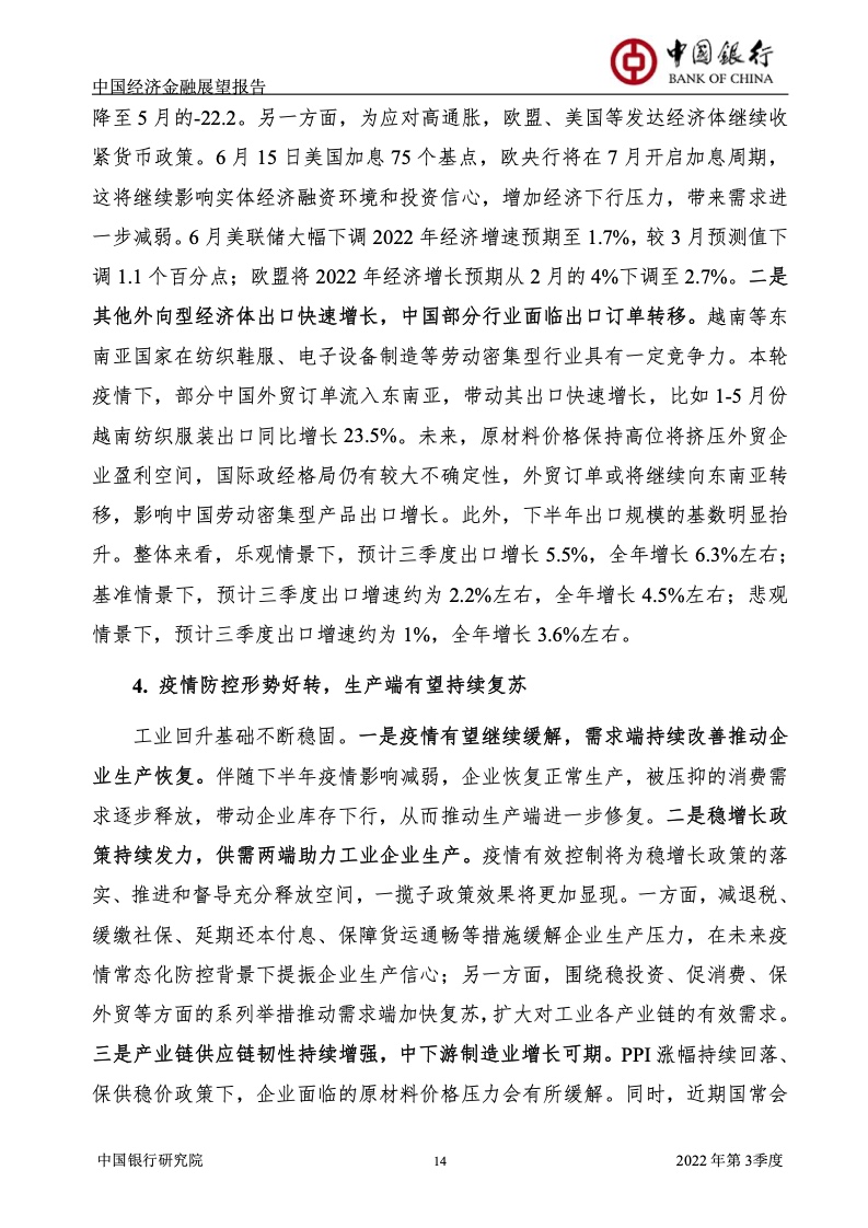 展望下半年,外部环境更趋严峻复杂,内需将替代外需成为稳定宏观经济大盘的关键。疫情对经济的冲击预计将进一步减弱,一系列稳经济政策逐步显效,经济有望逐季回升。考虑到疫情不确定性,悲观、基准、乐观三种情形下,预计三季度GDP分别增长3.2%、4.6%、6%左右,全年GDP分别增长3.2%、4%、4.7%左右。建议持续落实落细《扎实稳住经济的一揽子政策措施》,全力稳增长、稳就业、稳预期。