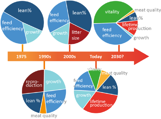 随着时间的推移,育种的目标也在逐渐发生变化,从原来的关注猪的外貌、饲料转化率(增重一公斤所需要的饲料量)、瘦肉率和生长速度转变为如今关注终身繁殖、猪的健壮程度和肉质。
