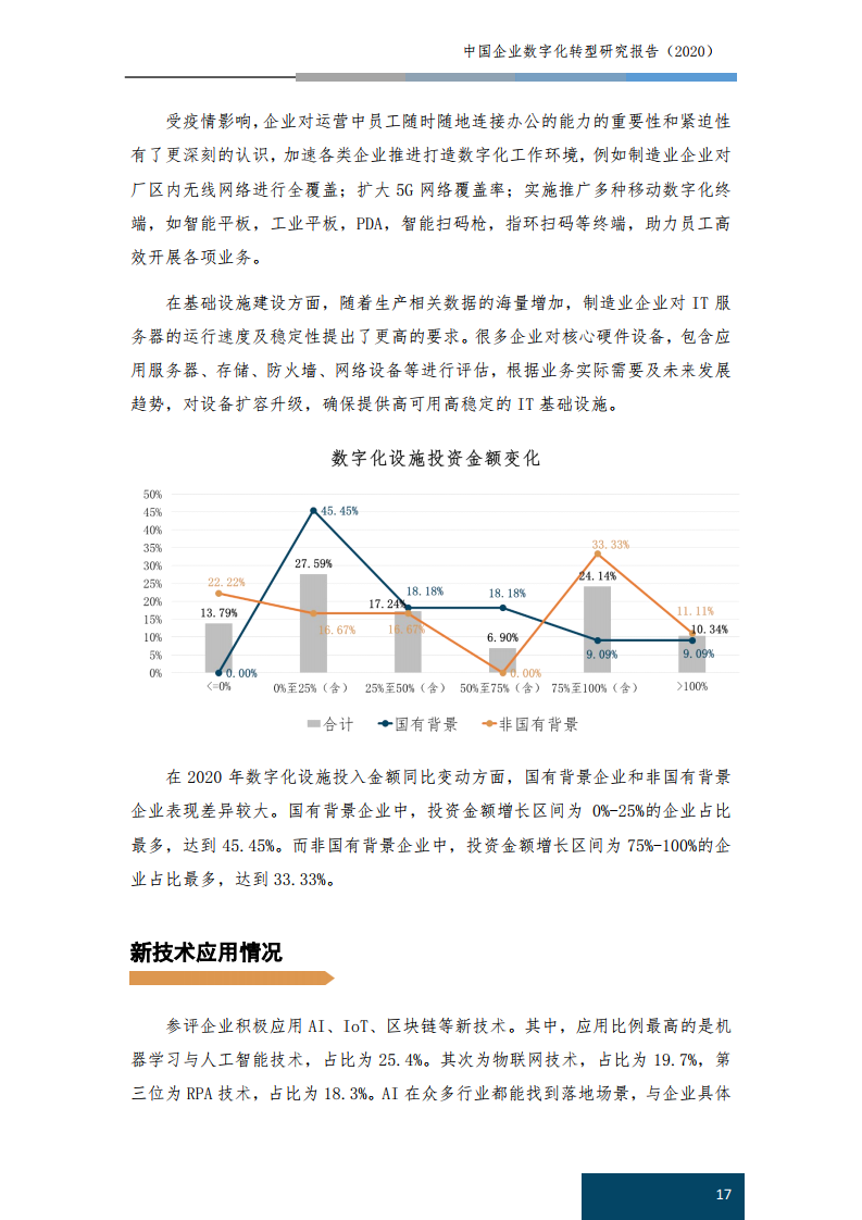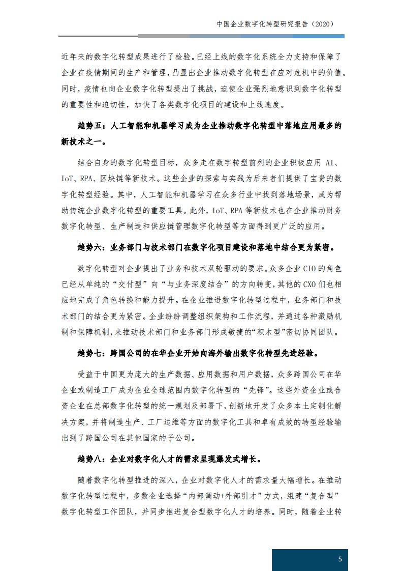 趋势五:人工智能成为数字化转型落地应用最多的新技术。人工智能和机器学习在众多行业中找到落地场景,而IoT、RPA等新技术也在财务、生产制造和供应链管理数字化转型等方面得到更广泛的应用。